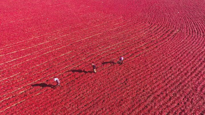 Cánh đồng ớt đỏ tây bắc tỉnh Tân Cương, Trung Quốc sau vụ thu hoạch