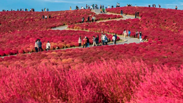 Du khách đi ngang qua cánh đồng cỏ kochia ở Công viên bờ biển Hitachi ở Katsuta, phía đông Tokyo. Thời điểm giữa tháng 10, cỏ kochia chuyển từ màu xanh sang đỏ và trở thành thiên đường cho giới nhiếp ảnh gia