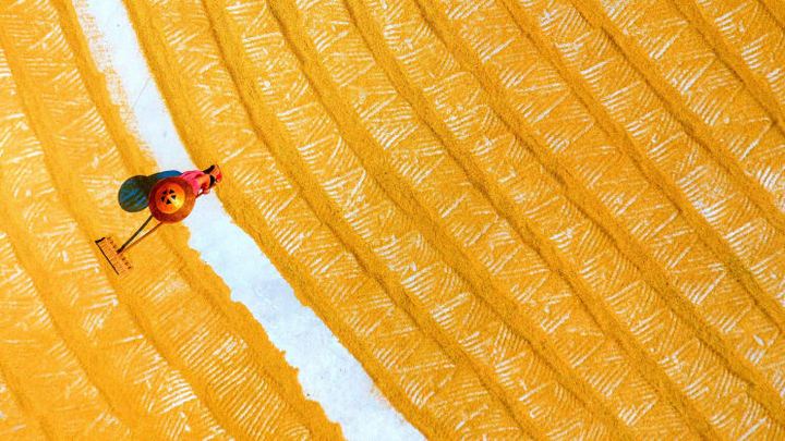 Ảnh chụp một nông dân đang cào thóc sau vụ mùa tại tỉnh Hồ Nam, Trung Quốc
