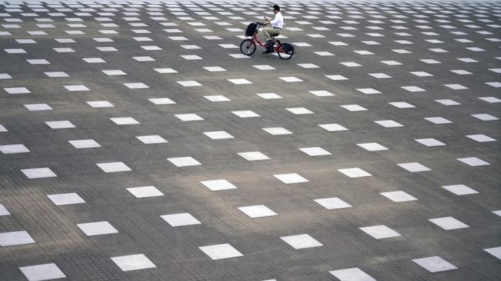 Một người đàn ông đi xe đạp điện trên thành phố cảng Yokohama, Nhật Bản