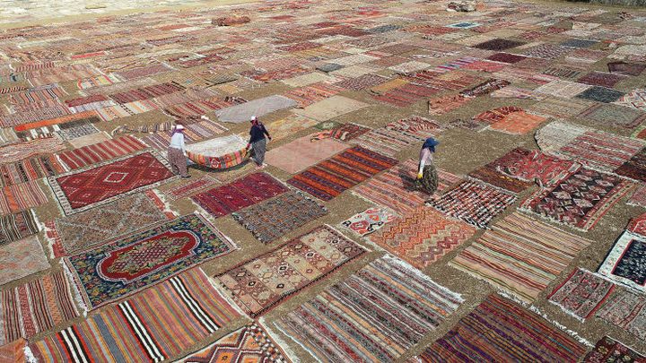 Các nghệ nhân ở Antalya, Thổ Nhĩ Kỳ phơi thảm đan bằng tay dưới ánh nắng Mặt Trời để thuốc nhuộm ngấm vào sợi vải nhanh hơn