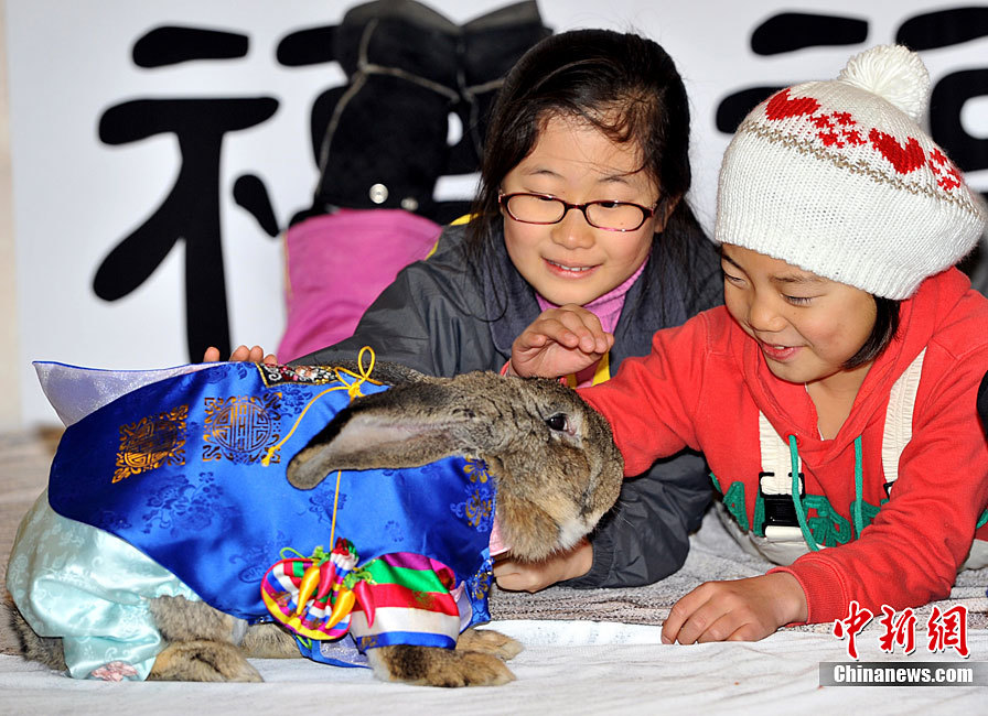 Các em nhỏ đã rất thích thú khi được cha mẹ đưa tới công viên Everland tại thành phố Yonging, Gyeonggi-do (Hàn Quốc) để ngắm những chú thỏ đáng yêu trong trang phục truyền thống.