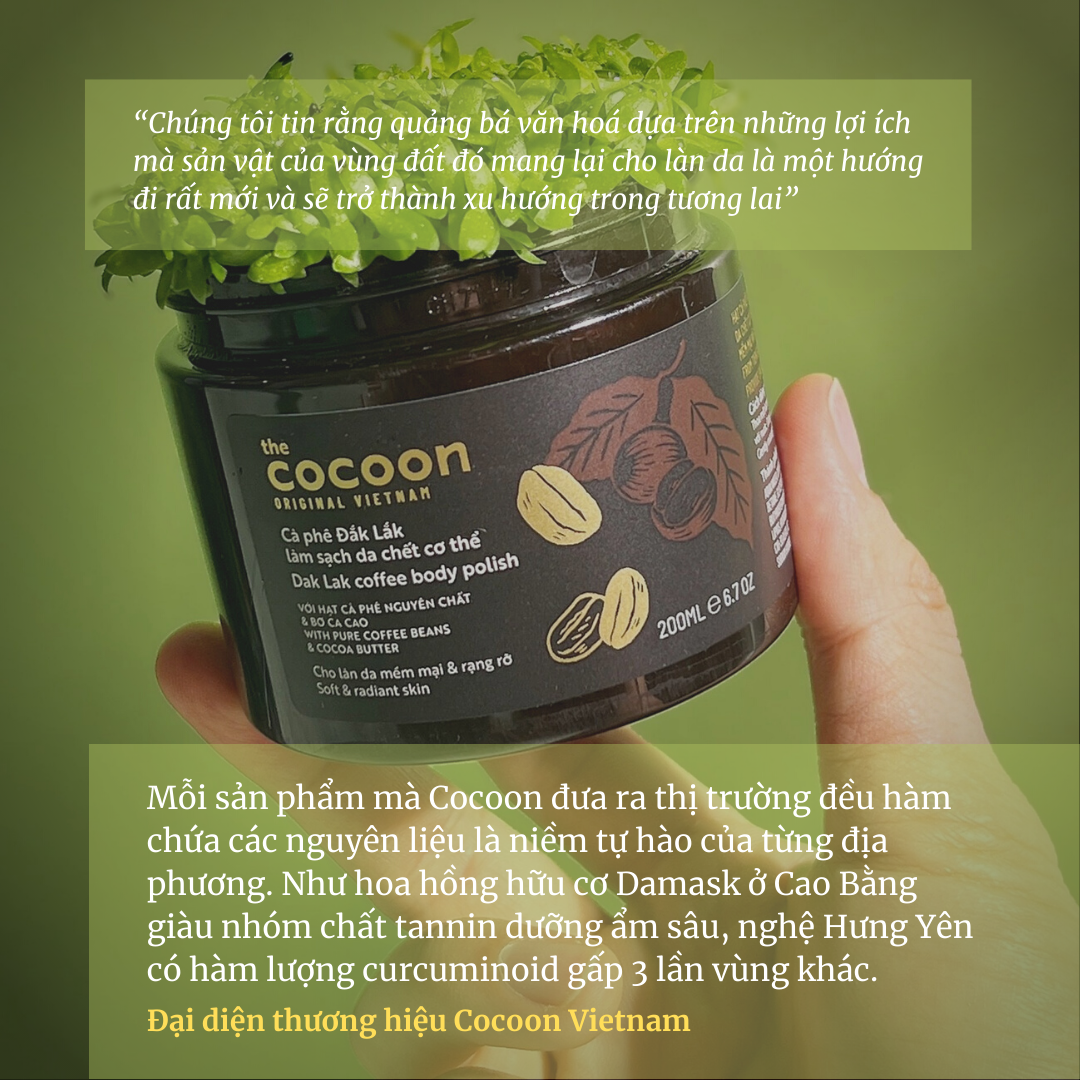 Trải qua quá trình nghiên cứu và thử nghiệm, Cocoon đã tìm ra những đặc trưng thú vị về các nguyên liệu đặc hữu vùng miền và đưa chúng vào sản phẩm. Nổi bật có cà phê Đắk Lắk, đường thốt nốt An Giang, hoa hồng hữu cơ Cao Bằng, nghệ Hưng Yên, dầu dừa Bến Tre, bơ cacao Tiền Giang, bí đao, bưởi…Tất cả đều được nuôi trồng trên những vùng đất có điều kiện khí hậu thuận lợi cùng điều kiện canh tác tốt để tạo nên những sản vật giàu dưỡng chất nhất.
