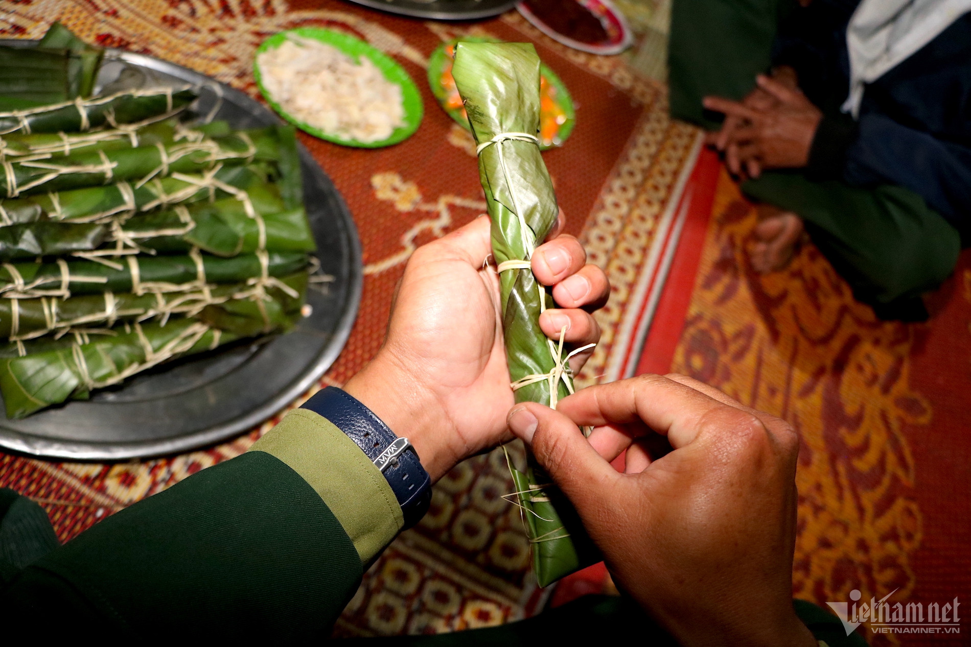 Ngồi cạnh già Lý, Thượng úy Hồ Văn Thông – cán bộ vận động quần chúng, Đồn Biên phòng Thanh đang thoăn thoắt tạo khuôn, đặt nếp, buộc lạt. Chỉ chưa đầy 5 phút, Thượng úy Thông đã gói xong một chiếc bánh beng. Chỉ vào chiếc bánh vừa được hoàn thiện, Thượng úy Thông chia sẻ: “Chữ “beng” trong tiếng người Pa Kô - Vân Kiều có nghĩa là đoàn kết. Các sợi lạt buộc vào bánh được liên kết chặt chẽ với nhau, như tình đoàn kết, gắn bó của người dân nơi miền sơn cước này”.