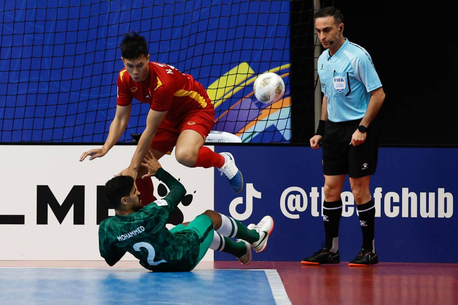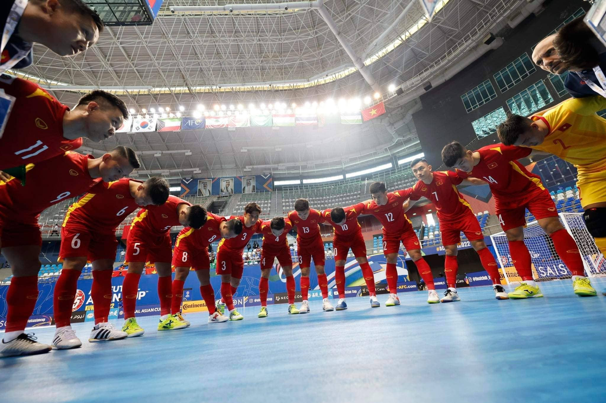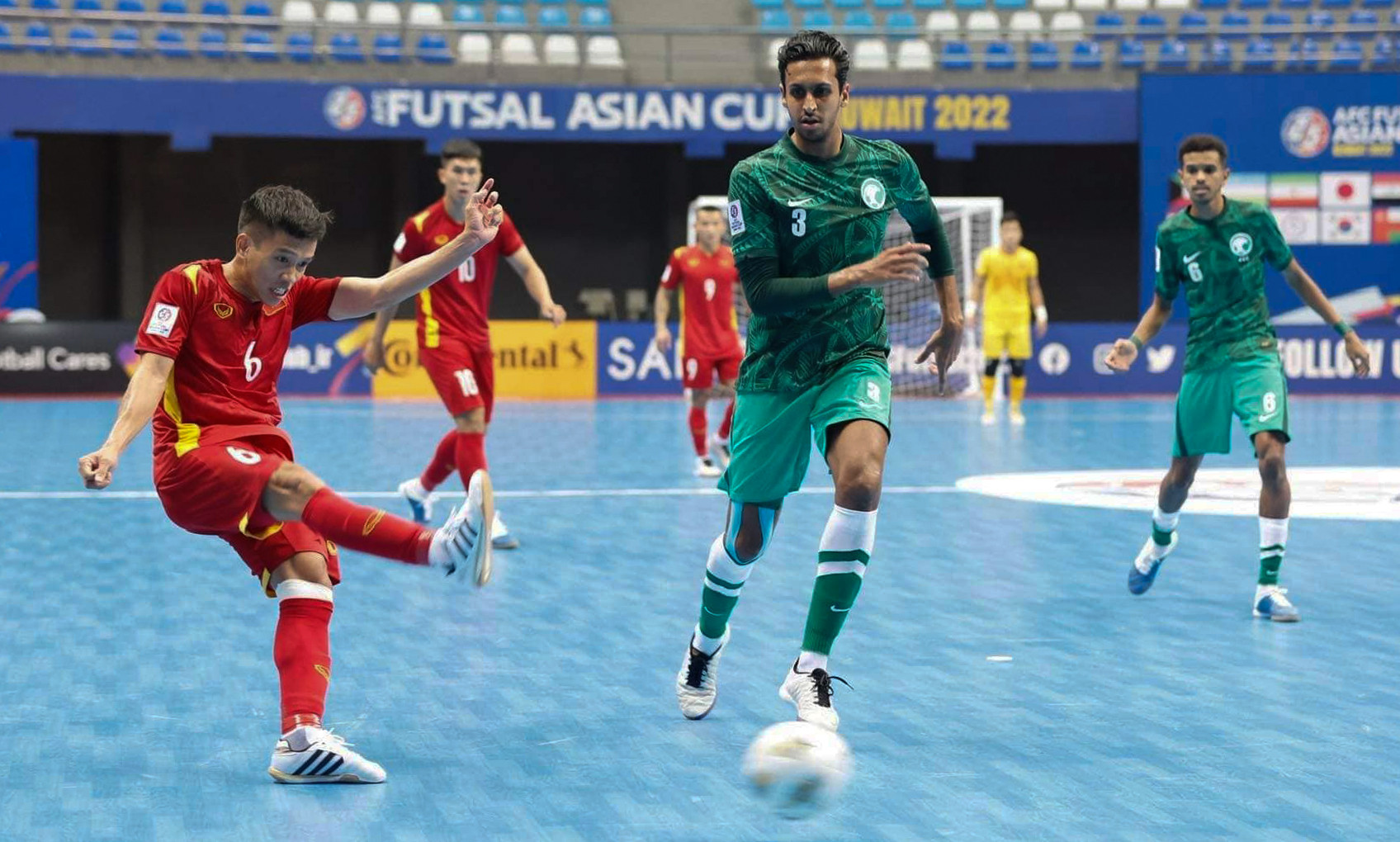 Sau trận thắng tưng bừng 5-1 trận ra quân trước Hàn Quốc, tuyển futsal Việt Nam quyết tâm có thêm chiến thắng khi tiếp Saudi Arabia - đội tạo nên cú sốc khi đánh bại Nhật Bản 2-1Trước trận đấu, tuyển futsal Việt Nam chịu sức ép lớn khi Nhật Bản thắng đậm Hàn Quốc 6-0. Kết quả này buộc đội bóng áo đỏ phải giành trọn 3 điểm để không phải rơi vào tình cảnh khó khăn bởi trận cuối gặp Nhật BảnTuyển futsal Việt Nam nhập cuộc đầy quyết tâmĐoàn quân của HLV Diego Giustozzi đã nghiên cứu đối thủ rất kỹLối chơi tấn công đa dạng giúp tuyển futsal Việt Nam kiểm soát được thế trận và tạo ra nhiều cơ hội nguy hiểm hơnNgười hâm mộ Việt Nam không phải chờ đợi lâu khi đến phút thứ 8, đoàn quân của ông Diego Giustozzi đã có bàn thắng khai thông thế bế tắc. Đoàn Phát căng ngang rất chính xác để Anh Duy đệm bóng, ghi bàn thắng cho đội nhàHồ Văn Ý tiếp tục có một trận đấu xuất sắc, có những tình huống cứu thua ngay trên vạch vôiCác cầu thủ áo đỏ chơi lăn xả. Trong hiệp 2, tuyển futsal Việt Nam tạo thế chủ động hoàn toàn. Phút 28, Minh Trí và đồng đội có bàn thắng thứ hai vào lưới Saudi Arabia. Đó là tình huống Đoàn Phát lại thực hiện cú bấm bóng gần giữa sân đưa bóng đi thẳng vào lưới đối thủSaudi Arabia đã tạo áp lực đáng kể lên phần sân của tuyển futsal Việt Nam. Trong thế trận chủ động ấy, đoàn quân của HLV Andreu Alvarez có bàn rút ngắn 1-2Sau một pha giải vây từ tình huống hãm thành bằng chiến thuật power-play của đối thủ, Minh Tri tung cú vô lê ngay trước vạch cấm địa của tuyển futsal Việt Nam, đưa bóng đi thẳng vào khung thành đã bỏ trống của Saudi Arabia để ấn định chiến thắng 3-1. Tuyển futsal Việt Nam có 2 trận thắng liên tiếp ở bảng D, có cơ hội rất lớn giành vé đi tiếpNiềm vui của các CDDV Việt Nam.