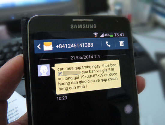 Sáng ngày 21/5, anh Xuân Hoàng (trú tại Cầu Giấy, Hà Nội) bất ngờ nhận được tin nhắn SMS gửi đi từ số điện thoại 01245141388 với nội dung: “Cần mua gấp trong ngày thuê bao 091XXX của bạn với giá 2,5 triệu, vui lòng gọi 19006759 để được hướng dẫn giao dịch và gặp khách hàng cần mua”.
