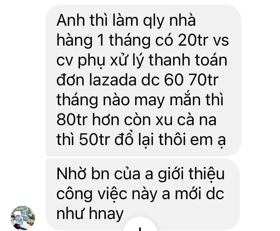 L.R, một nhân viên làm việc tại Vietcombank Hà Nội cho hay, chị được một nam thanh niên gửi lời kết bạn kèm lời giới thiệu bản thân rất “hoành tráng”: “Anh làm quản lý nhà hàng, một tháng có 20 triệu với công việc phụ xử lý thanh toán đơn Lazada được 60-70 triệu. Tháng nào may mắn thì được 80 triệu hơn, còn xu cà na (xui xẻo – tiếng lóng của giới trẻ - PV) thì 50 triệu đổ lại thôi em ạ. Nhờ bạn của anh giới thiệu công việc này anh mới được như hôm nay.”