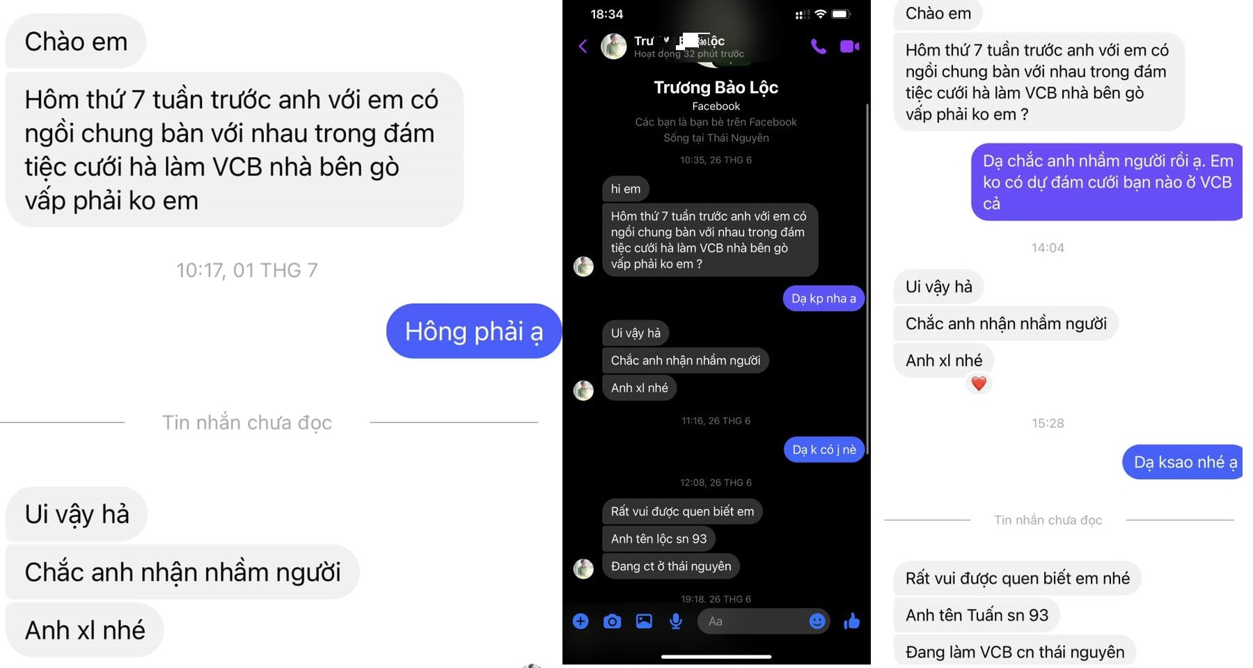 Theo phản ánh của nhiều người, các đối tượng thường gửi lời kết bạn rồi chủ động nhắn tin làm quen với một “văn mẫu” quen thuộc: “Chào em/anh, hôm thứ Bảy tuần trước anh/em có gặp em/anh ở đám cưới bạn X”, hoặc “gặp ở nhà hàng Y”.