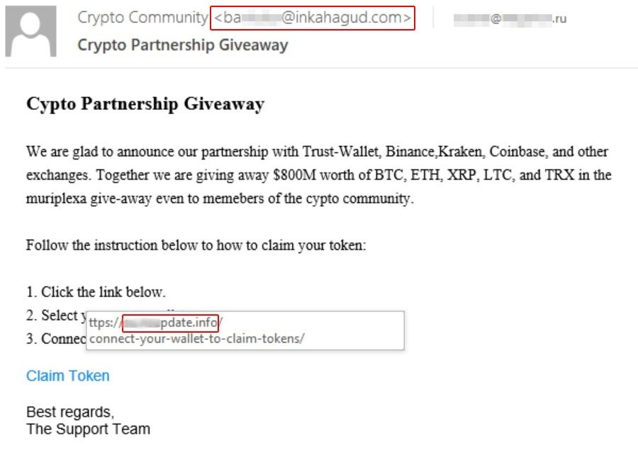 Kẻ lừa đảo sẽ gửi một email giả mạo với cách trình bày hệt như thật. Nạn nhân sau đó được đề nghị tham gia vào một chương trình tặng quà, với phần thưởng là các loại tiền mã hóa.