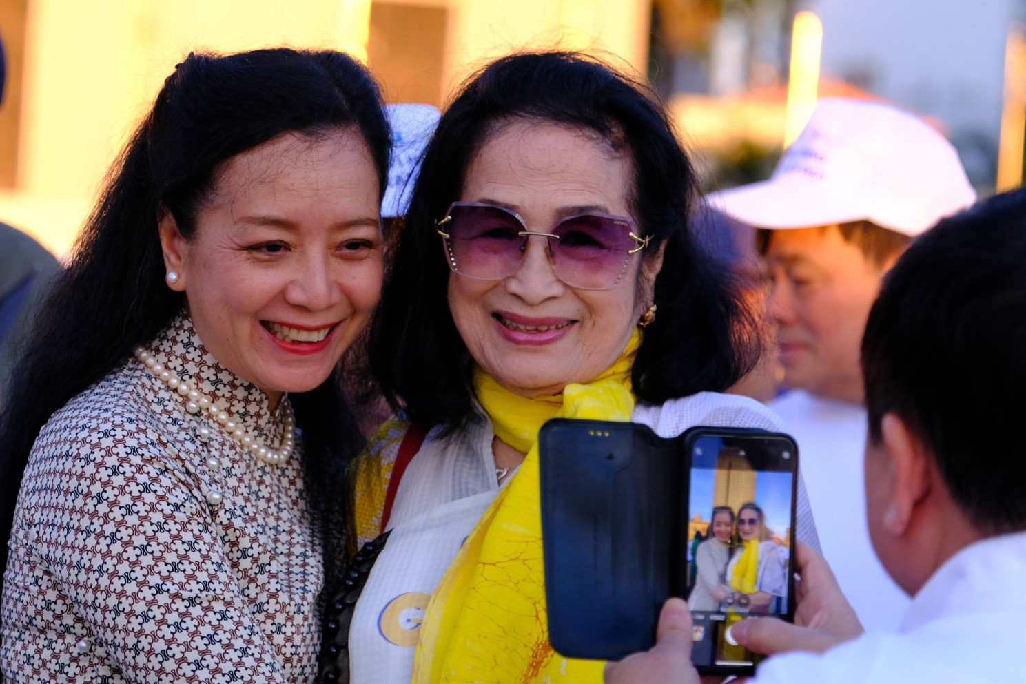 Nhạc sĩ Đỗ Hồng Quân giúp vợ lưu lại khoảnh khắc hạnh phúc khi Chiều Xuân gặp lại thần tượng Trà Giang ở Nha Trang.