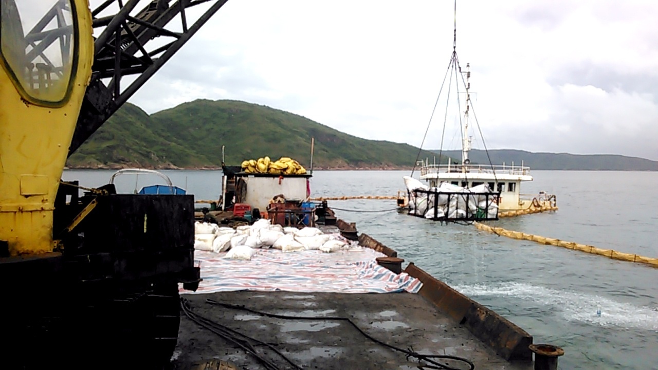 | Sà lan trọng tải 500 tấn được đưa ra khu vực tàu Hà Trung 98 để trục vớt hàng hóa. |