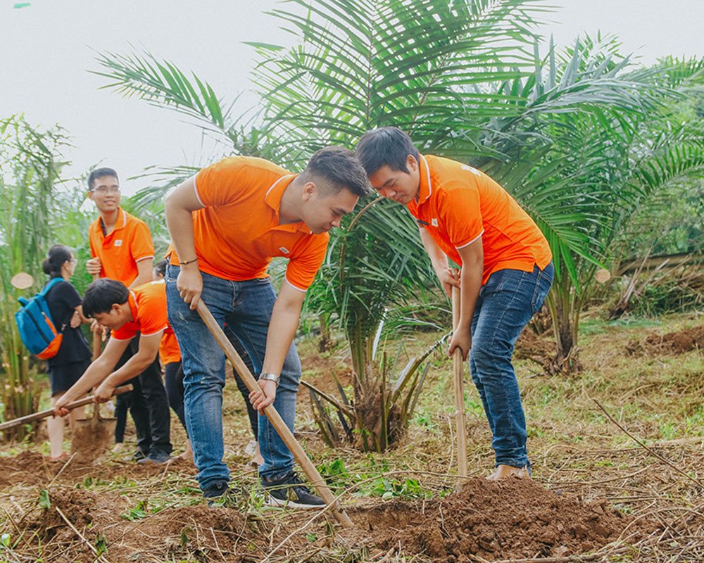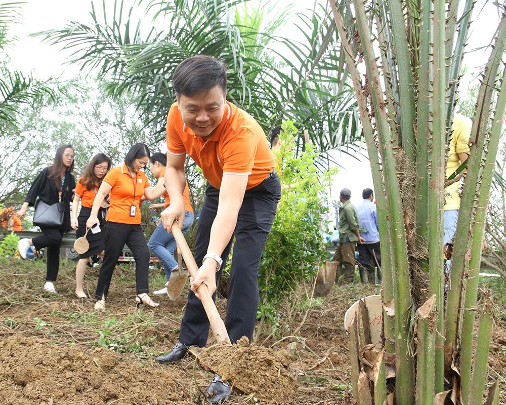 CEO FPT Software Phạm Minh Tuấn cùng nhân viên FPT Software trồng cây xanh trên đường Hòa Lạc |