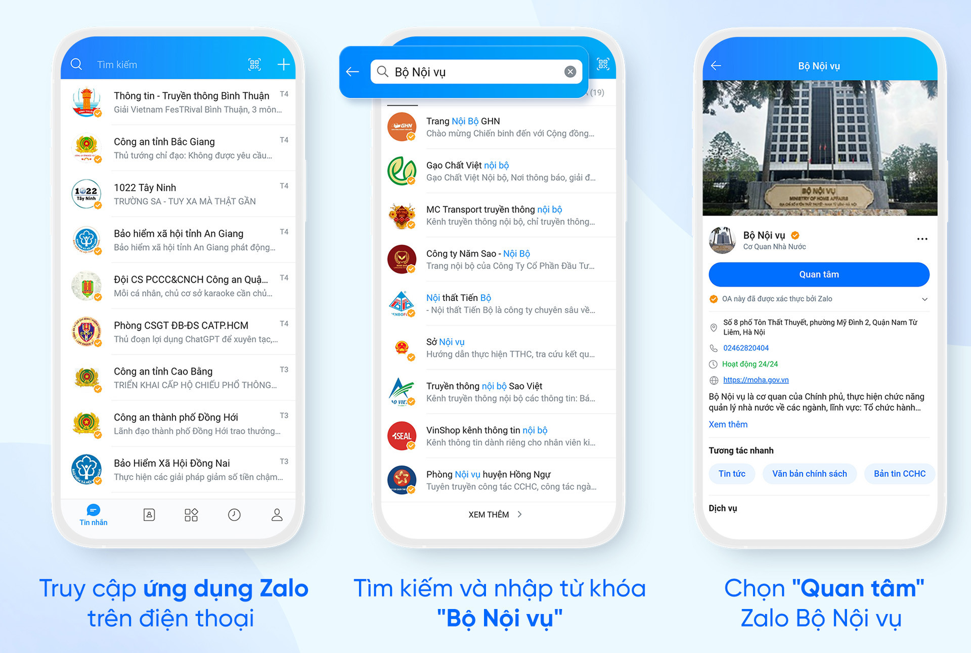 Trang Zalo “Bộ Nội vụ” đang cung cấp các tiện ích chính gồm: Tin tức; Văn bản chính sách; Bản tin cải cách hành chính; Tin đa phương tiện. Để sử dụng và trải nghiệm các tiện ích, người dân chỉ cần truy cập Zalo, tìm kiếm từ khóa "Bộ Nội Vụ”, sau đó bấm “Quan tâm” trang Zalo “Bộ Nội vụ”.