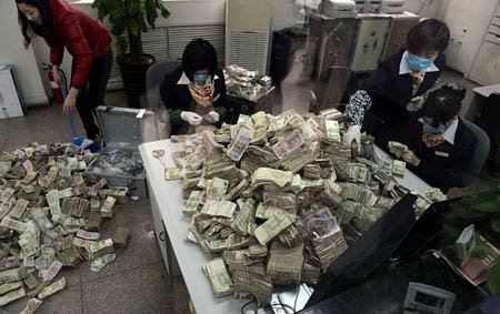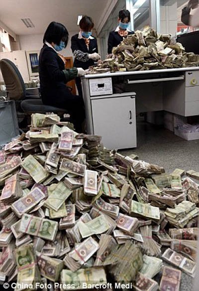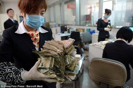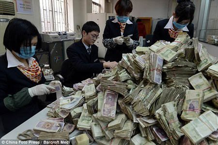 Các nhân viên giao dịch tại một ngân hàng ở Trịnh Châu, Trung Quốc đã không khỏi tất bật sau khi một khách hàng chở 13 bao tiền giấy và 2 túi tiền xu tới gửi.