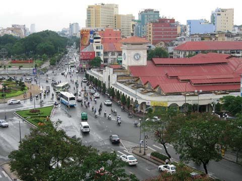 | Cổng chính chợ Bến Thành với tháp đồng hồ - biểu tượng của Sài Gòn - đối diện quảng trường Quách Thị Trang |
