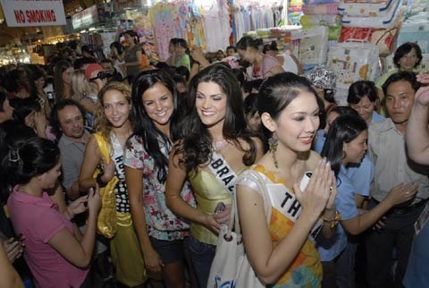 | Những bông hoa của cuộc thi Miss Universe 2008 làm rộn ràng thêm không khí của chợ Bến Thành |