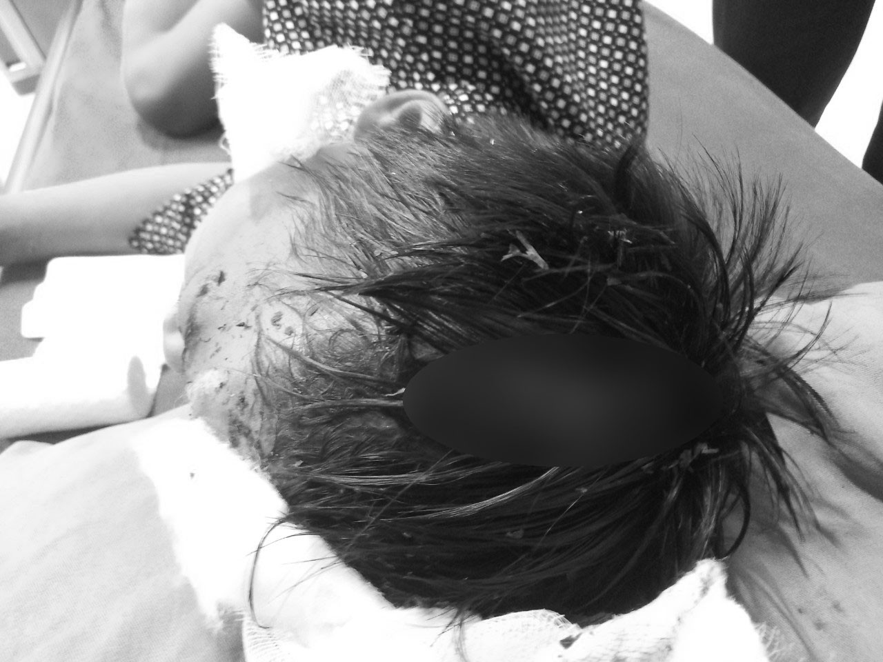 Bệnh nhi được đưa vào cấp cứu tại phòng khám của bệnh viện này ở Sơn Dương (Tuyên Quang) trong tình trạng sợ hãi, hoảng loạn. Bé có vết thương đỉnh phải khoảng 8cm, vết thương đỉnh trái khoảng 6cm sâu lộ xương sọ, vết thương vùng trán khoảng 2cm, các vết thương vùng tay phải kích thước từ 1-2cm.