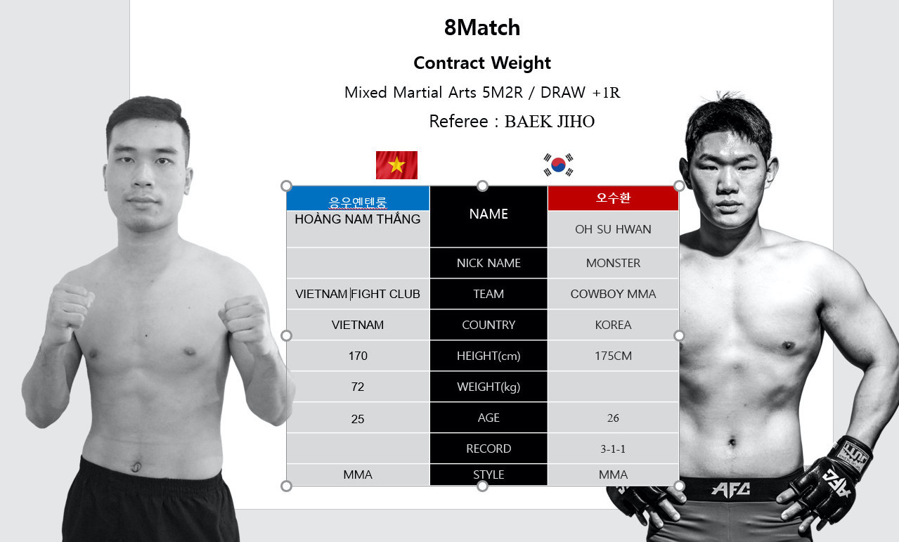 Tâm điểm sẽ là màn so tài giữa đại diện Việt Nam Hoàng Nam Thắng và võ sĩ chuyên nghiệp Oh Su Hwan. Trước đó, Nguyễn Tiến Long mới là cái tên được chọn so tài với đối thủ tới từ Hàn Quốc, tuy nhiên ngay sát ngày lên sàn, võ sĩ của lò Quyền Vương MMA bất ngờ bỏ cuộc.