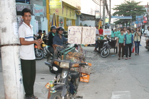 Gà được nhốt trong lồng đặt ở ghế sau xe gắn máy. Trên mỗi lồng đều có một hoặc hai con được cột chân đứng làm mẫu; bên dưới lồng gà, một tấm biển đề chữ thật to: “gà vườn 85.000đ/con”.