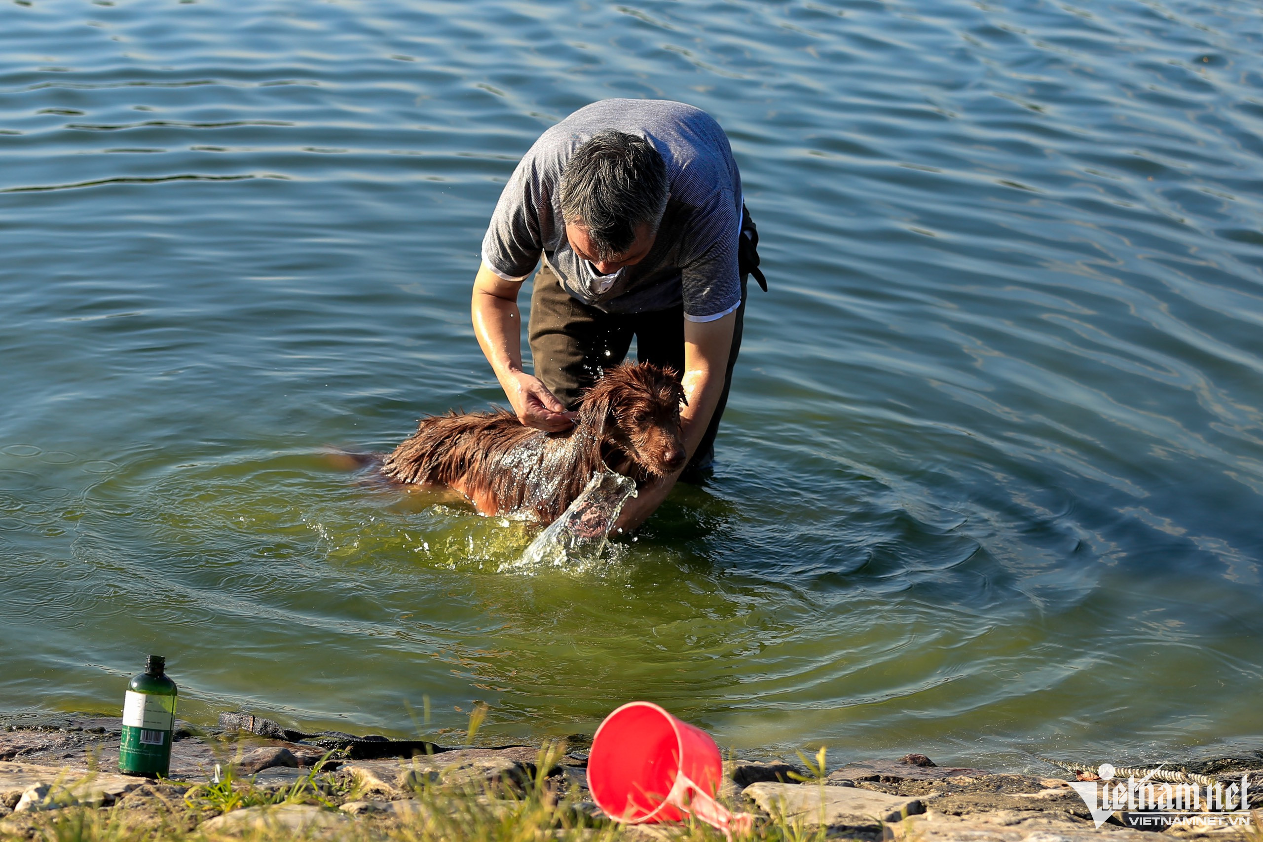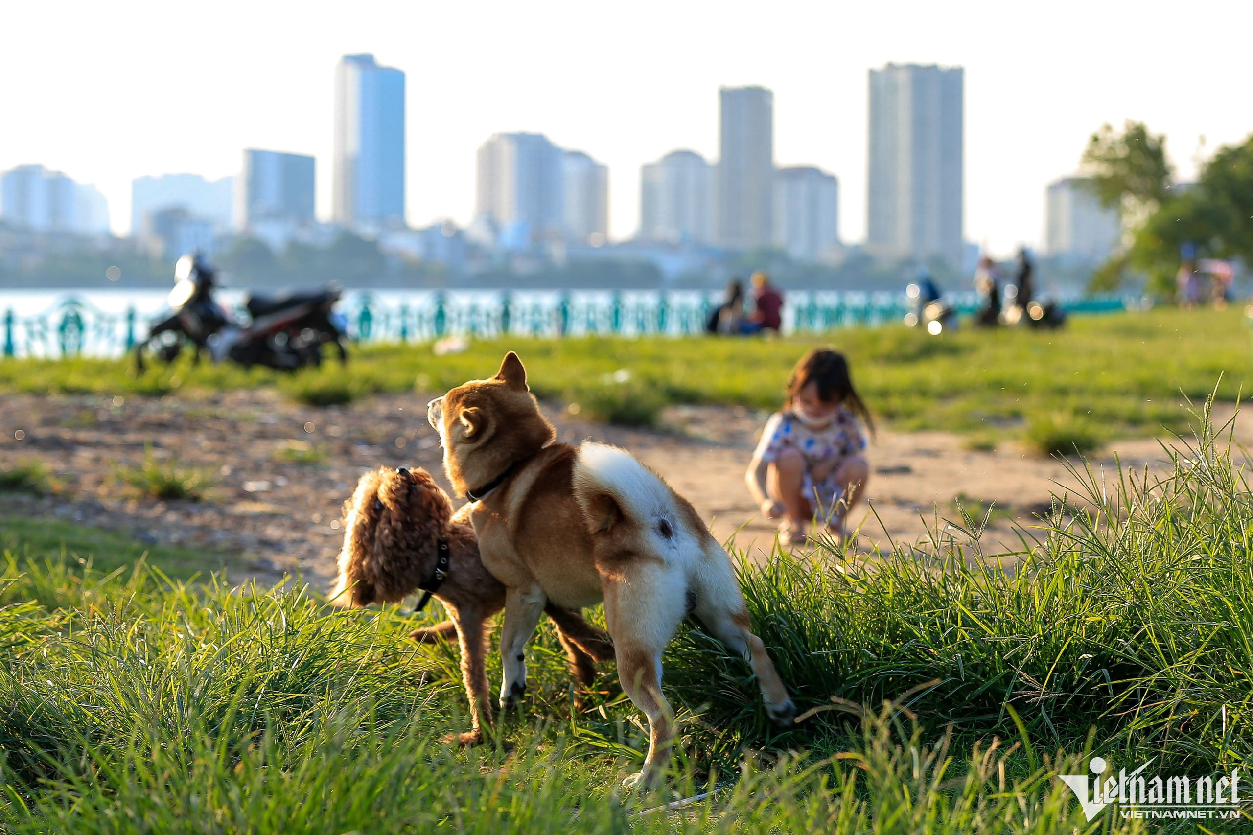 Tháng 4 vừa qua, Hà Nội thực hiện kế hoạch chương trình quốc gia phòng, chống bệnh dại trên địa bàn và thành lập hơn 600 đội bắt chó thả rông. Tuy nhiên, tại một số địa điểm công cộng như bãi đất ven hồ Tây, công viên Thống Nhất, tình trạng chó thả rông, không có xích giữ lẫn rọ mõm vẫn diễn ra. Đội bắt chó thả rông bao gồm các thành phần bảo vệ tổ dân phố, dân quân tự vệ, công an, y tế và nhân viên thú y. Tuy nhiên quá trình hoạt động còn gặp nhiều khó khăn như dụng cụ bắt chó chưa chuyên dụng, nhiều con to khi bị bắt đã gây thương tích cho tổ và việc xác minh chủ nuôi còn nhiều bất cập.Bãi cỏ là nơi nhiều người đến hóng mát, thả diều vào mỗi buổi chiều. Người nuôi chó cũng thường xuyên lui tới vì rộng rãi, có thể để chó chạy nhảy thoải mái. Đa phần những chú chó đều không có dây giữ, rọ mõm theo quy định. Trong ảnh là giống chó Bully thừa hưởng gen từ dòng Pitbull, trông khá dữ.Có đủ loại từ nhỏ đến to, tây lẫn ta. Nhiều người vui chơi ở nơi công cộng dễ bị giật mình kinh sợ khi chó đột ngột chạy qua chân.Hai chú chó Siba và Poodle đánh nhau, gần đó có một số trẻ nhỏ đang chơi đùa. Theo một phụ nữ sống ở khu vực này, việc chó thả rông thuộc bất cứ giống nào cũng có thể gây nguy hiểm cho mọi người.Tại ven hồ Tây, các gia đình đưa con nhỏ đến để thả diều, ngắm hoàng hôn. Một em bé rụt rè khi thấy chú chó giống Poodle đi ngang qua. Việc thả rông chó gây nguy hiểm đến trẻ nhỏ cũng như người lớn nếu chưa tiêm phòng đầy đủ bởi nó có thể trở nên hung dữ bất cứ lúc nào. Trong ảnh, một chú chó hiếm hoi được chủ đeo rọ mõm cho đi chơi.Nhật Lệ (Xuân Đỉnh) vào mỗi buổi chiều đều cho chú chó tên Nô lên những khu đất trống ở hồ Tây để chạy nhảy giải phóng năng lượng. “Khi đưa Nô đến những địa điểm công cộng tôi luôn phải chuẩn bị rọ mõm, dây xích để nó không gây nguy hiểm đến người khác. Cứ một năm tôi sẽ cho tiêm phòng nhắc lại một lần”, Lệ nói. Tại công viên Thống Nhất, ban quản lý cũng đã đặt biển thông báo không dắt chó vào công viên nhưng nhiều người vẫn phớt lờ quy định này.Một người đàn ông còn cho một chú chó giống Bắc Hà bị nấm xuống hồ để tắm, không có rọ mõm. Phía xa có trẻ em, người lớn đang bơi lội. Chó Bắc Hà được đánh giá là có bản năng lãnh thổ cao, cảnh giác với người lạ và rất hiếu chiến. UBND phường Quảng An đã đặt biển nhắc nhở người dân về việc cấm chó thả rông và yêu cầu đeo rọ mõm, có xích giữ. Tuy nhiên, tấm biển không được nhiều chủ chó "lưu ý".