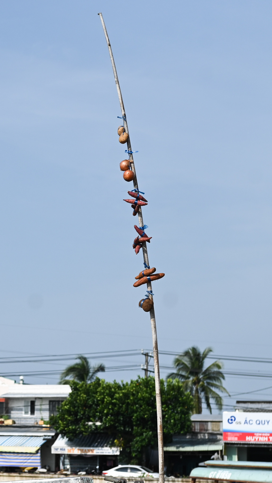 Các mặt hàng tại chợ nổi chủ yếu là trái cây, đặc sản miền Tây. Phía trước các ghe, thương lái cắm một chiếc cọc tre có treo các loại củ, quả... để khách trên các thuyền nhỏ ghé mua.
