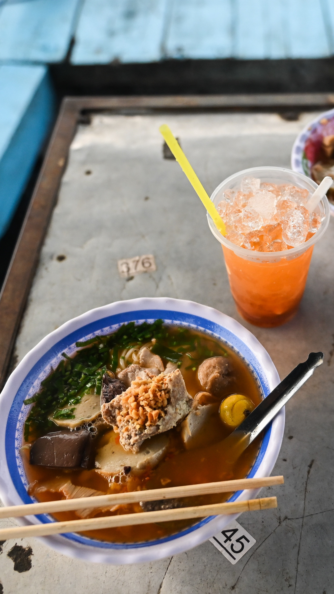 Phần lớn khách tới khu chợ vào buổi sáng để thưởng thức các món ăn đặc sản như bún riêu, hủ tiếu...