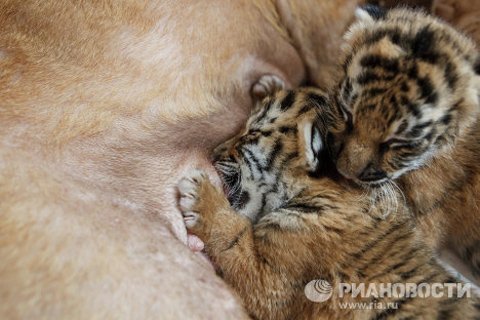 Sữa “mẹ” không đủ để nuôi chúng, nhất là hai con hổ lớn nhanh như thổi, người ta phải nuôi chúng bằng cả sữa dê.