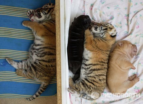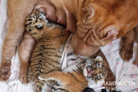 Xưa nay, do di truyền chó rất sợ hổ. Thế nhưng một cô chó giống Sharpey lại thản nhiên đón nhận hai chú hổ lạ mặt vào gia đình, tự nguyện nuôi nấng cùng với lũ con của mình.