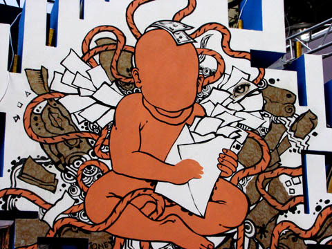 trừu tượng trong hội họa vậy. Bức tranh lợn đông hồ của Hoài Linh được cách điệu khoáy thành những chiếc loa để biểu trưng cho một thế giới hiện đại và ồn ã. Lần đầu vẽ tranh tường khổ lớn, Linh giản lược đi những đường nét và đẩy tốc độ vẽ nhanh hơn.