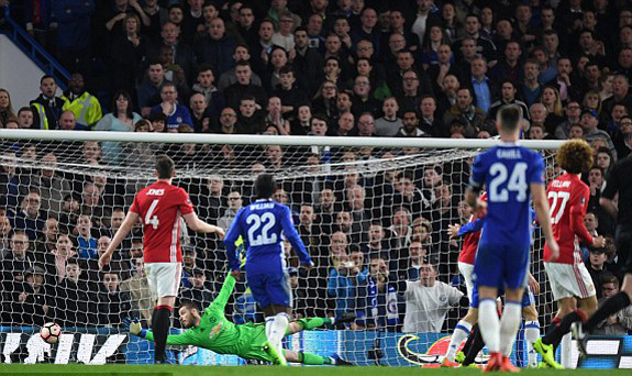 Hazard solo ngẫu hứng loại bỏ cả Smalling và Rojo rồi tung cú dứt điểm chéo góc buộc De Gea phải tung người cứu thua.