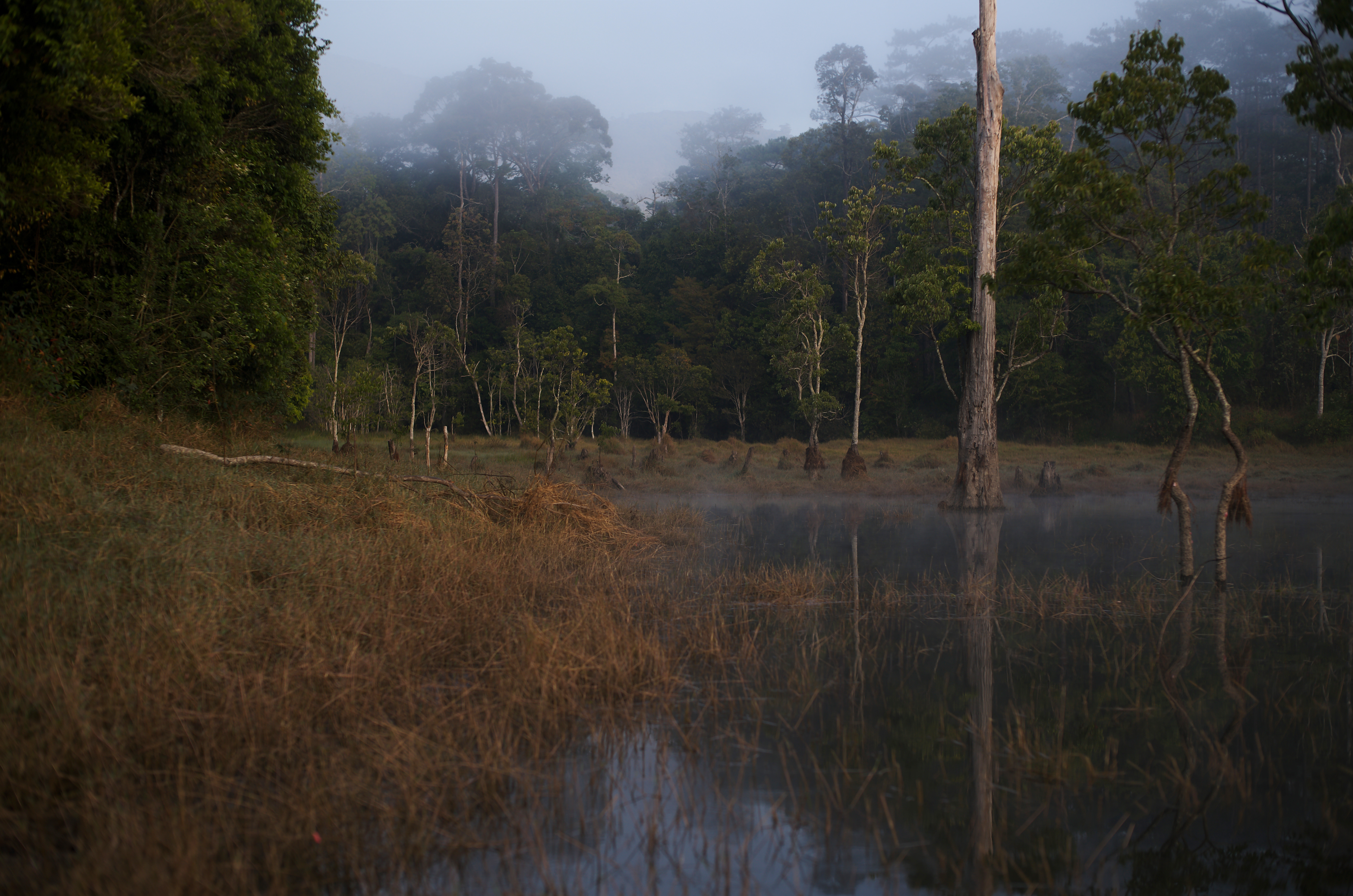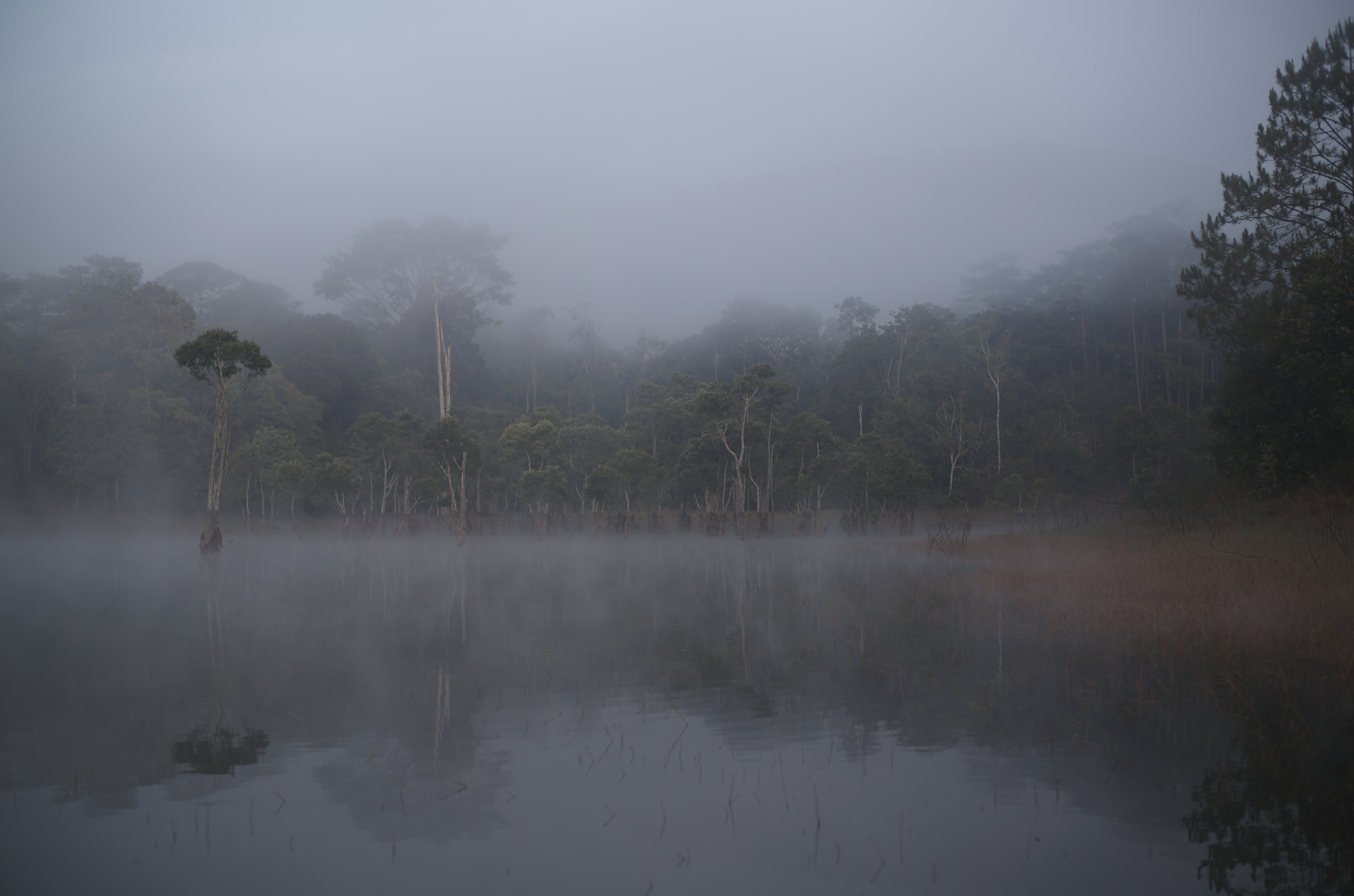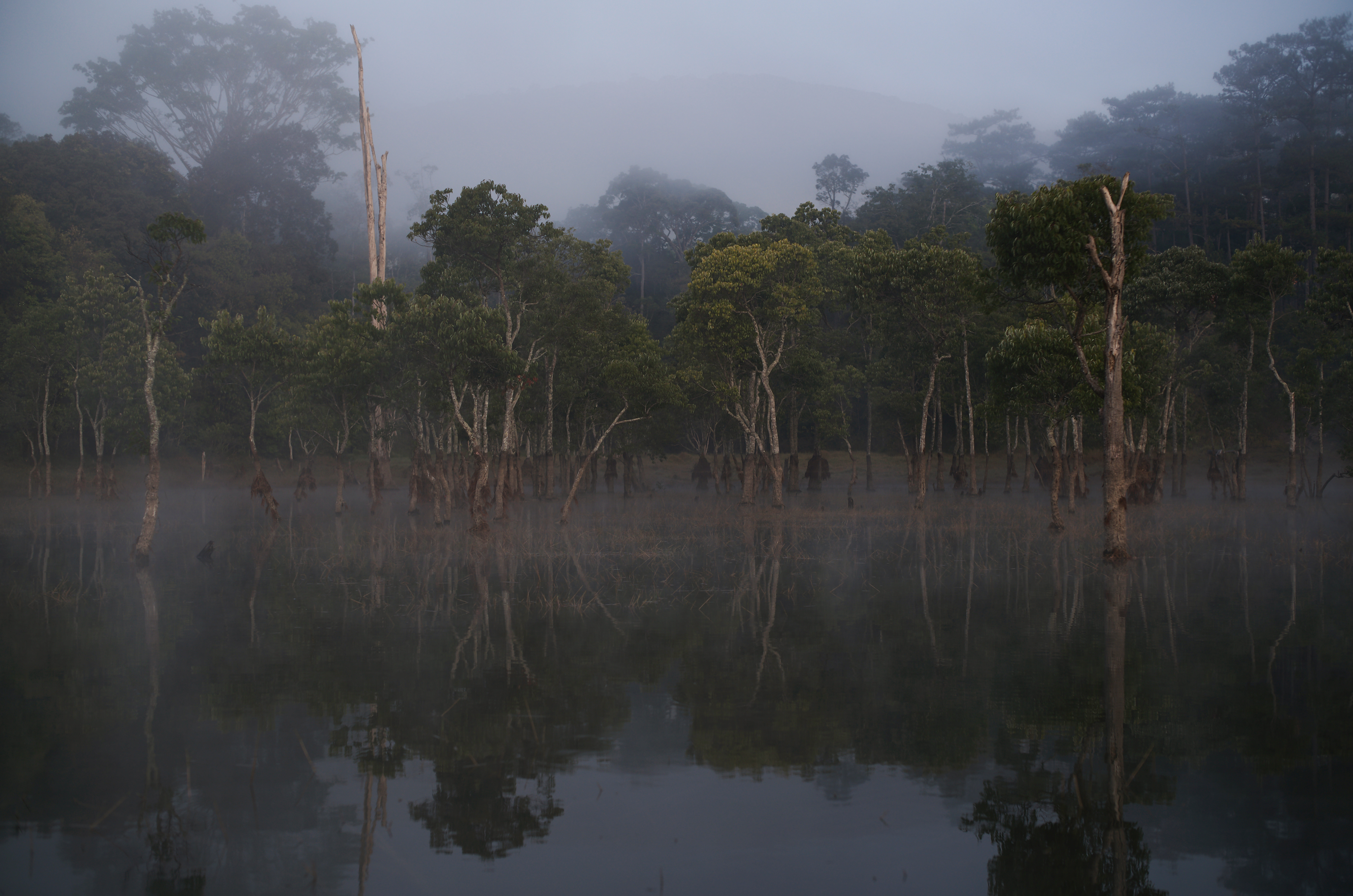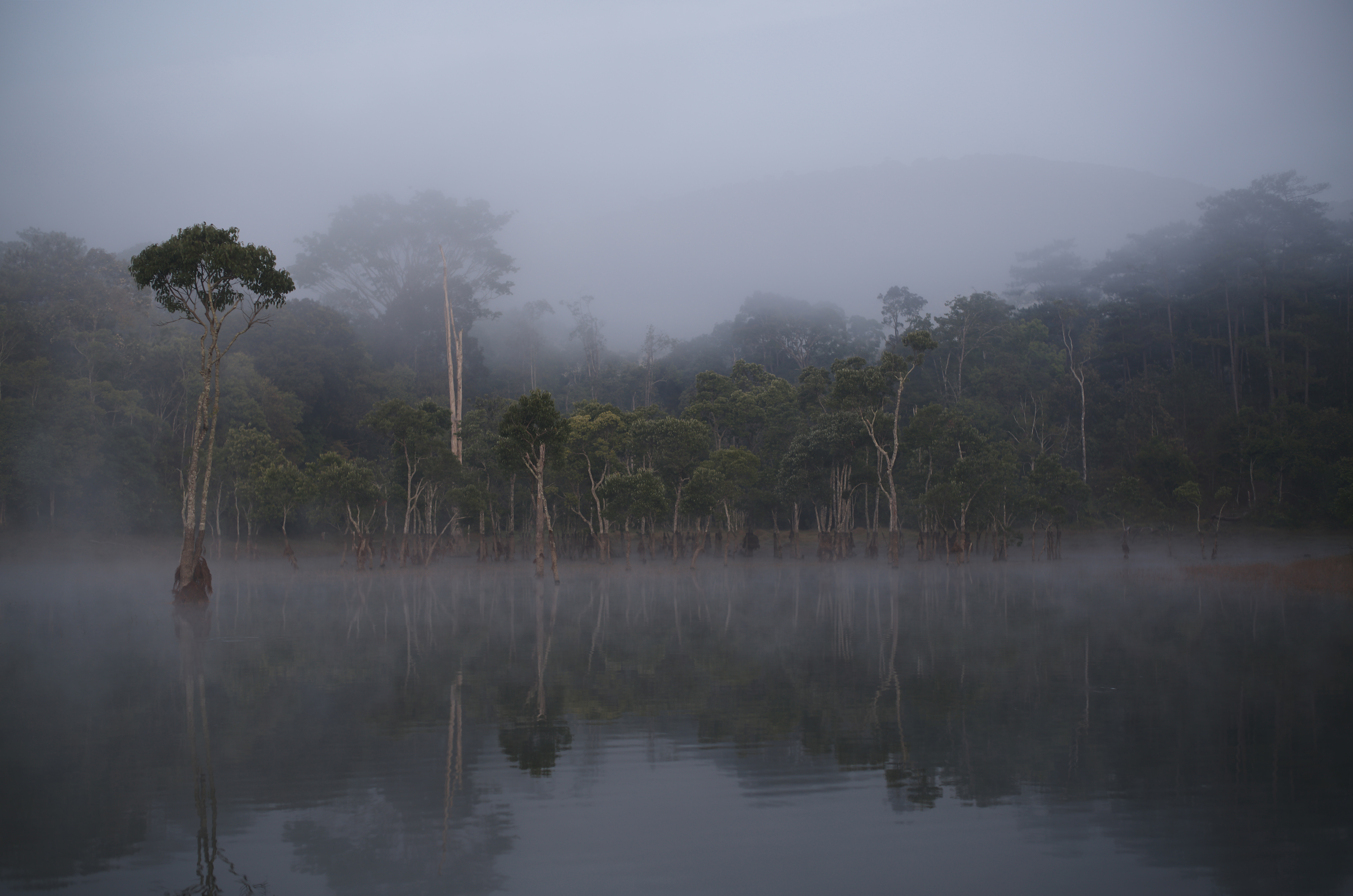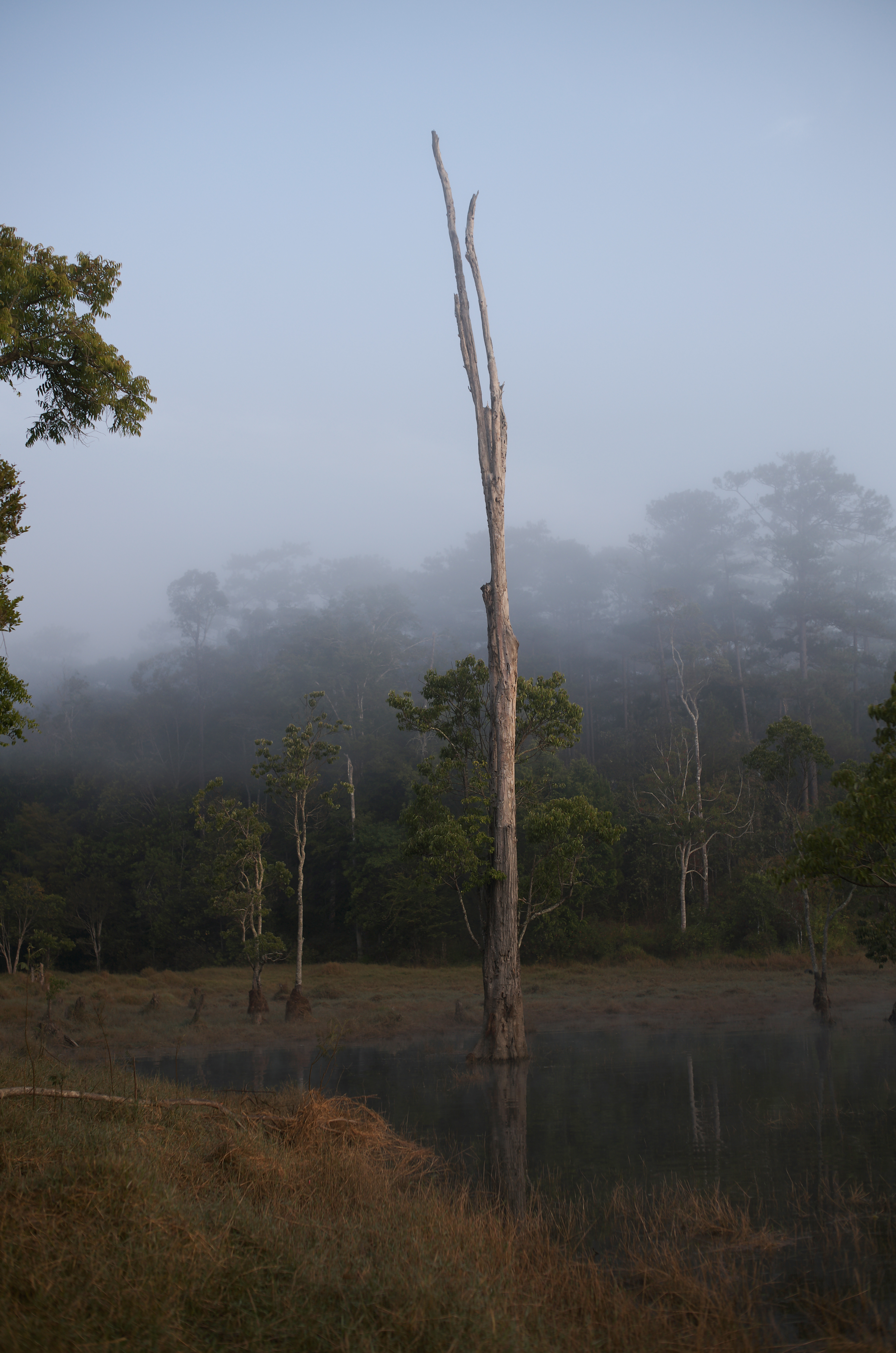 Những thân cây mảnh dẻ, khẳng khiu, vươn thẳng đứng giữa trời tạo nên khủng cảnh huyền ảo, mênh mang và ma mị.