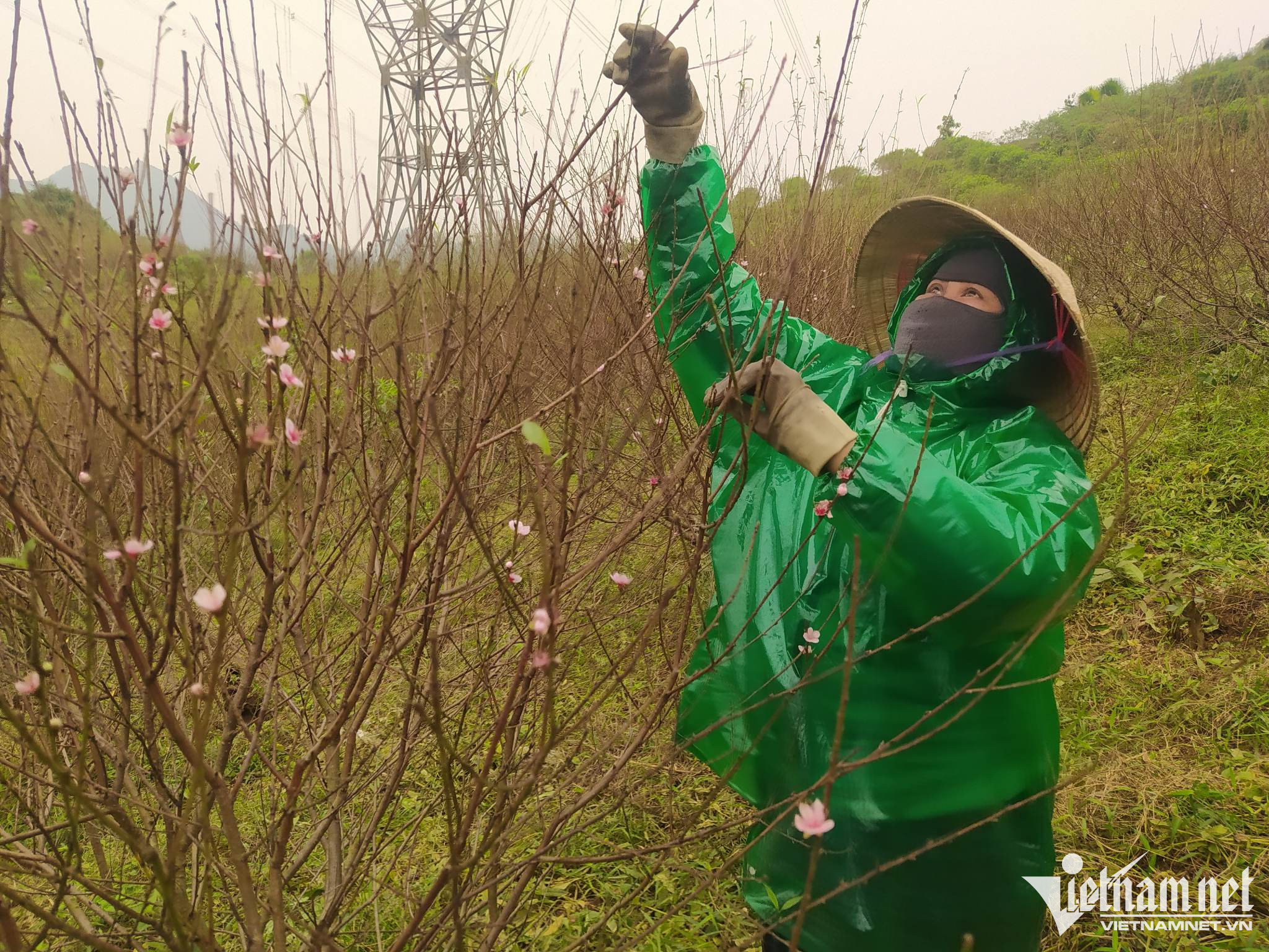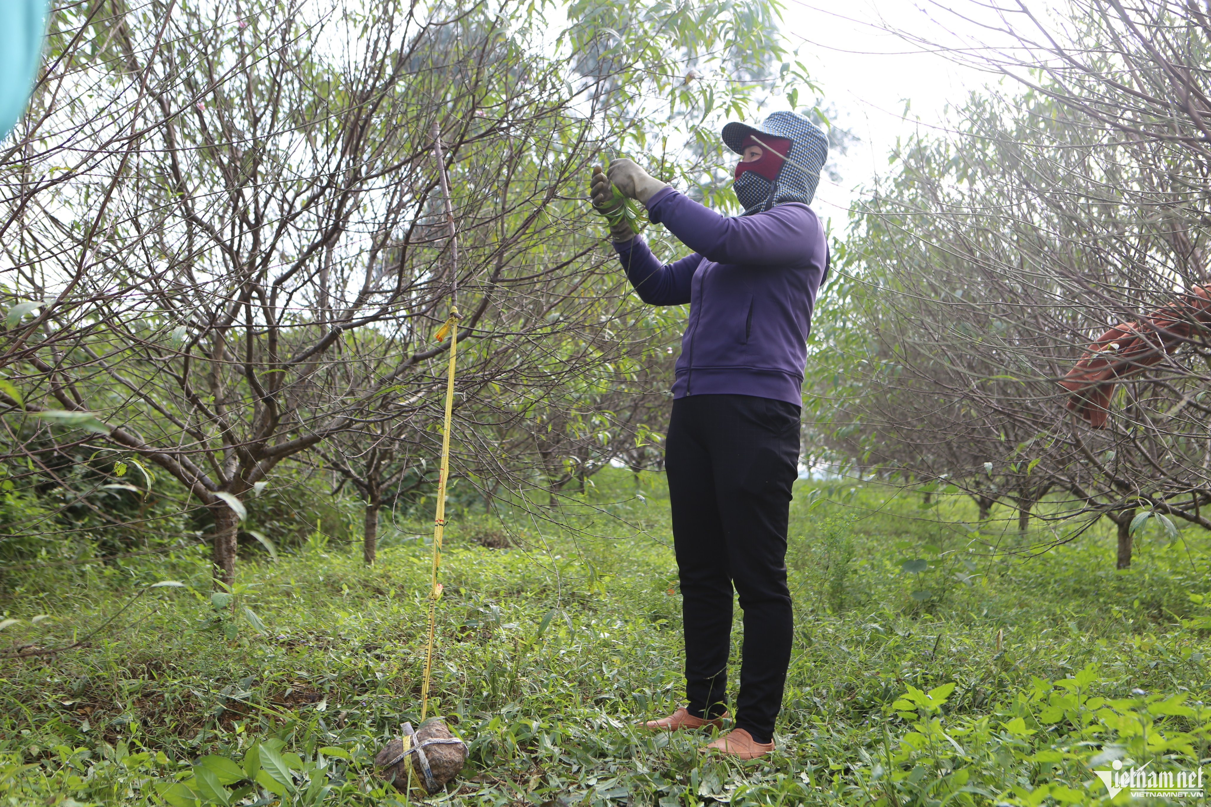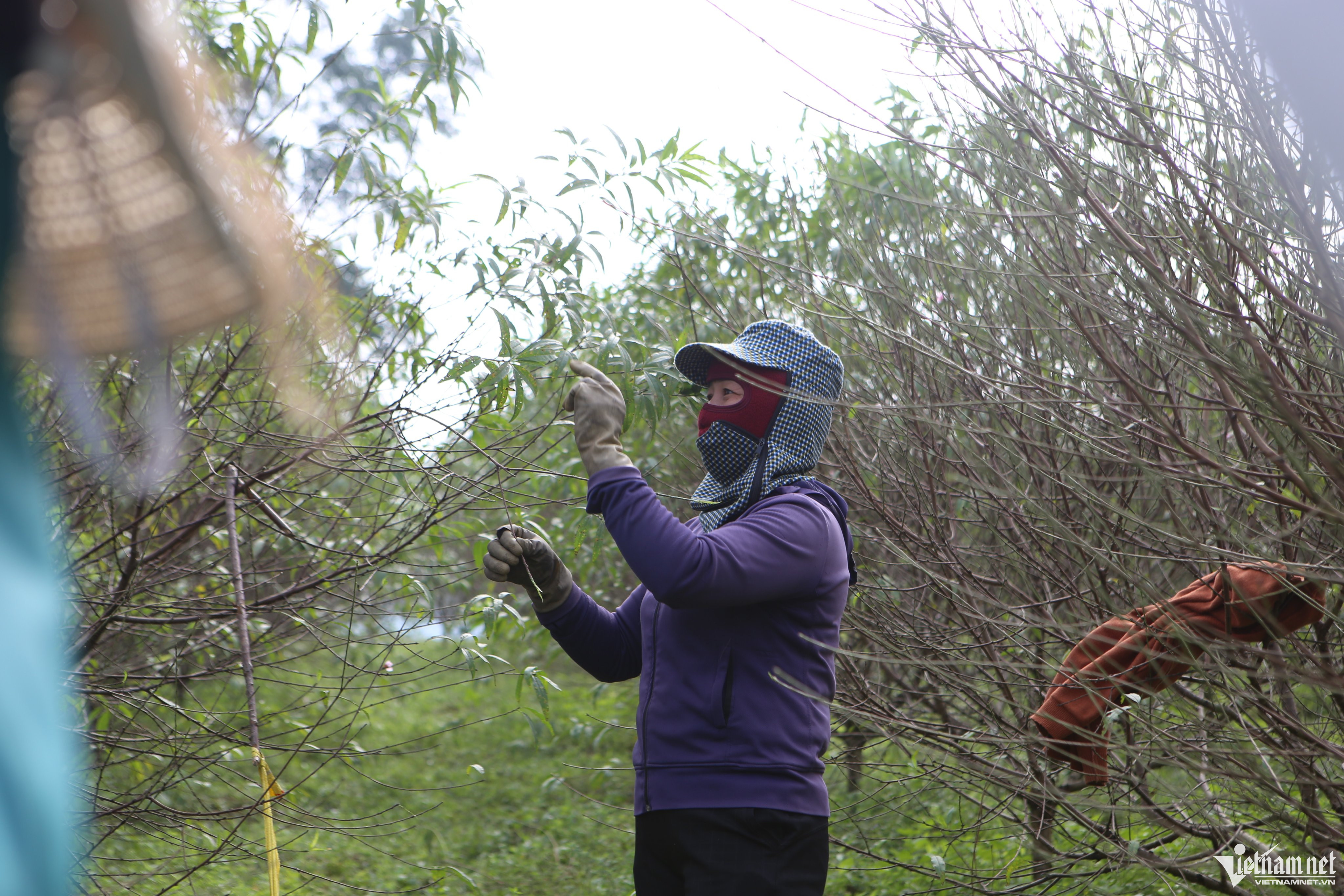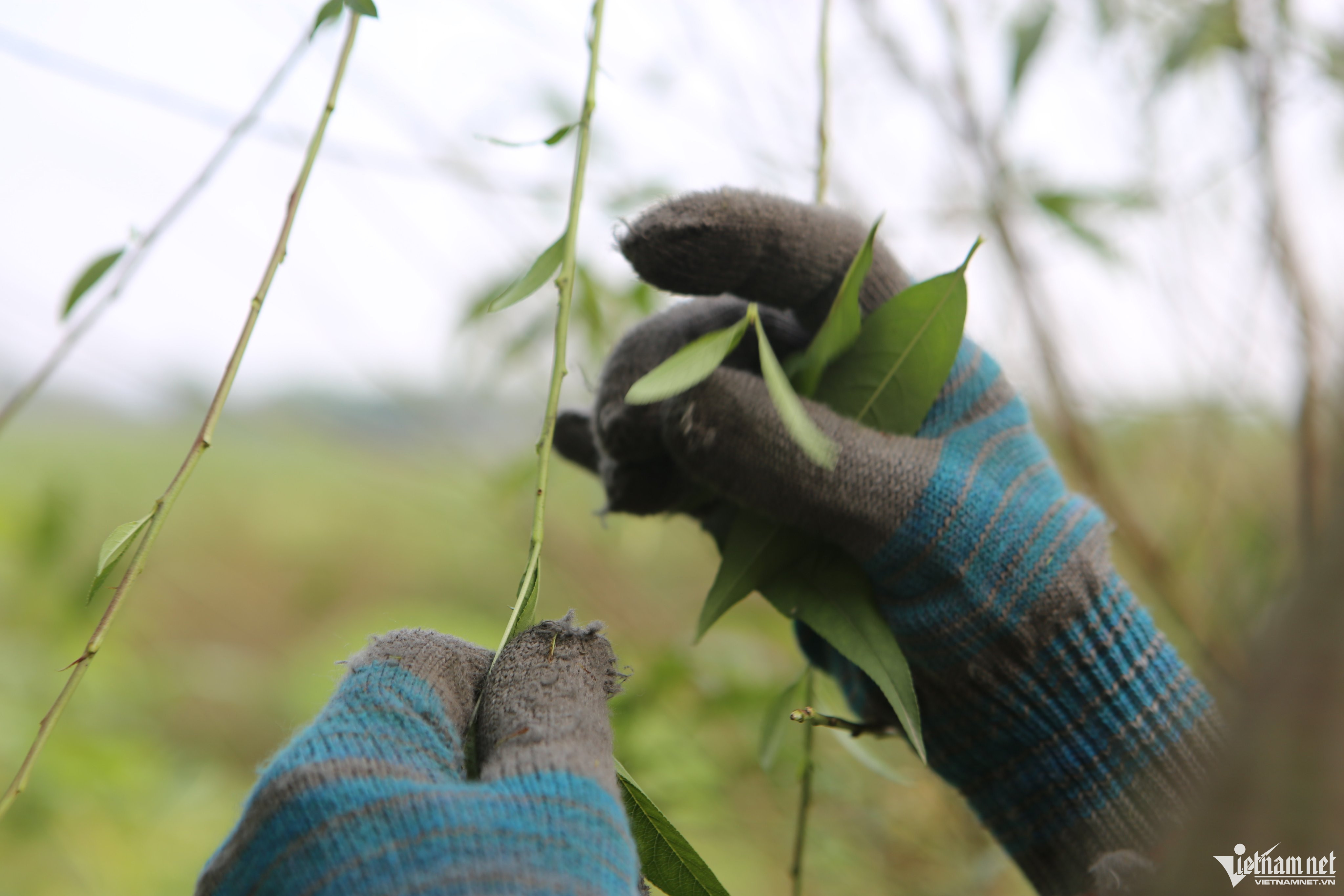 "Việc tuốt lá nếu trời nắng ráo thì khá nhẹ nhàng nhưng do thời gian này trời lạnh, kèm theo mưa phùn nên hái lá cũng bị chậm hơn. Tôi phải mặc áo mưa để đỡ lạnh, cản được gió. Đồng thời đeo tất tay để đỡ bị buốt. Những cây nào cao quá, chúng tôi phải dùng thang hoặc buộc đá để cành sà xuống sát đất cho dễ tuốt. Mỗi ngày tùy vào chủ vườn, lúc làm năng suất thì tôi có thể được trả 250.000 đồng/ngày. Công việc không mệt nhưng đứng và di chuyển nhiều giờ đồng hồ trong gió lạnh nên hơi mỏi chân", chị Hòa nói.