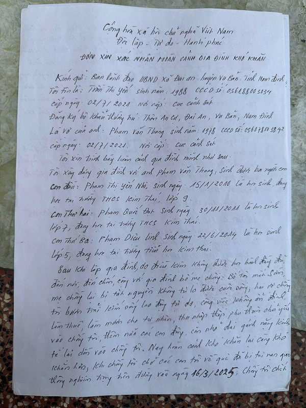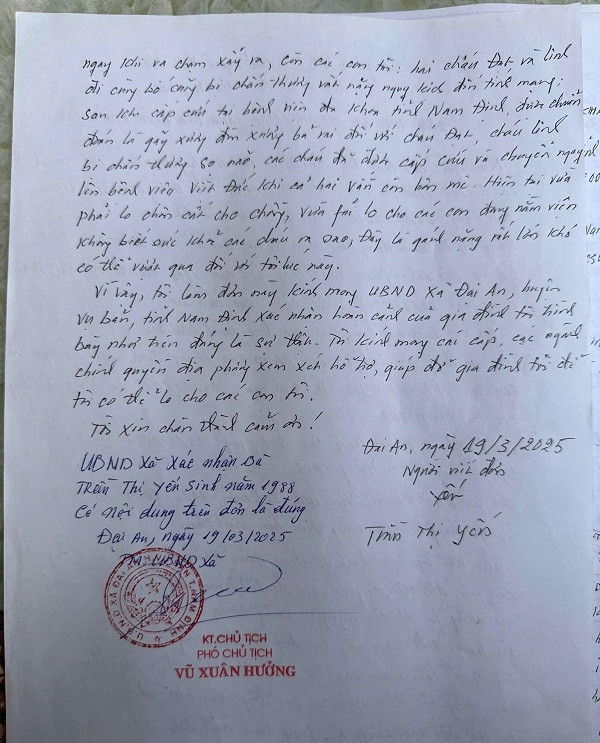 UBND xã Đại An, huyện Vụ Bản xác nhận, vợ chồng chị Trần Thị Yến, anh Phạm Văn Thung là công dân ở địa phương, có hoàn cảnh khó khăn. Mới đây, anh Thung cùng các con gặp tai nạn thương tâm, anh Thung đã không qua khỏi. Cả hai người con còn nhỏ, đều đang nằm viện, chi phí phát sinh tốn kém vượt ngoài khả năng lo liệu của gia đình. Rất mong hoàn cảnh của họ nhận được sự quan tâm, hỗ trợ từ phía cộng đồng.