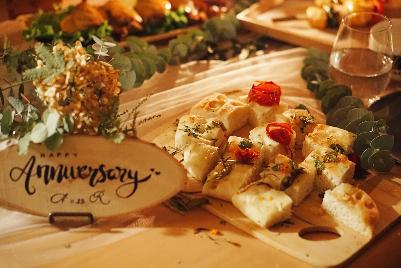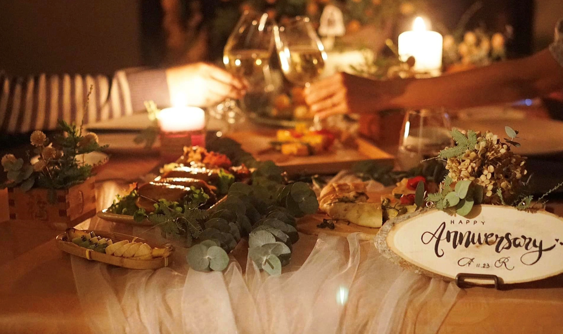 Bữa tiệc kỷ niệm của vợ chồng chị Chúc Lan bắt đầu trong một không gian lãng mạn, ngập tràn hoa lá và nến.