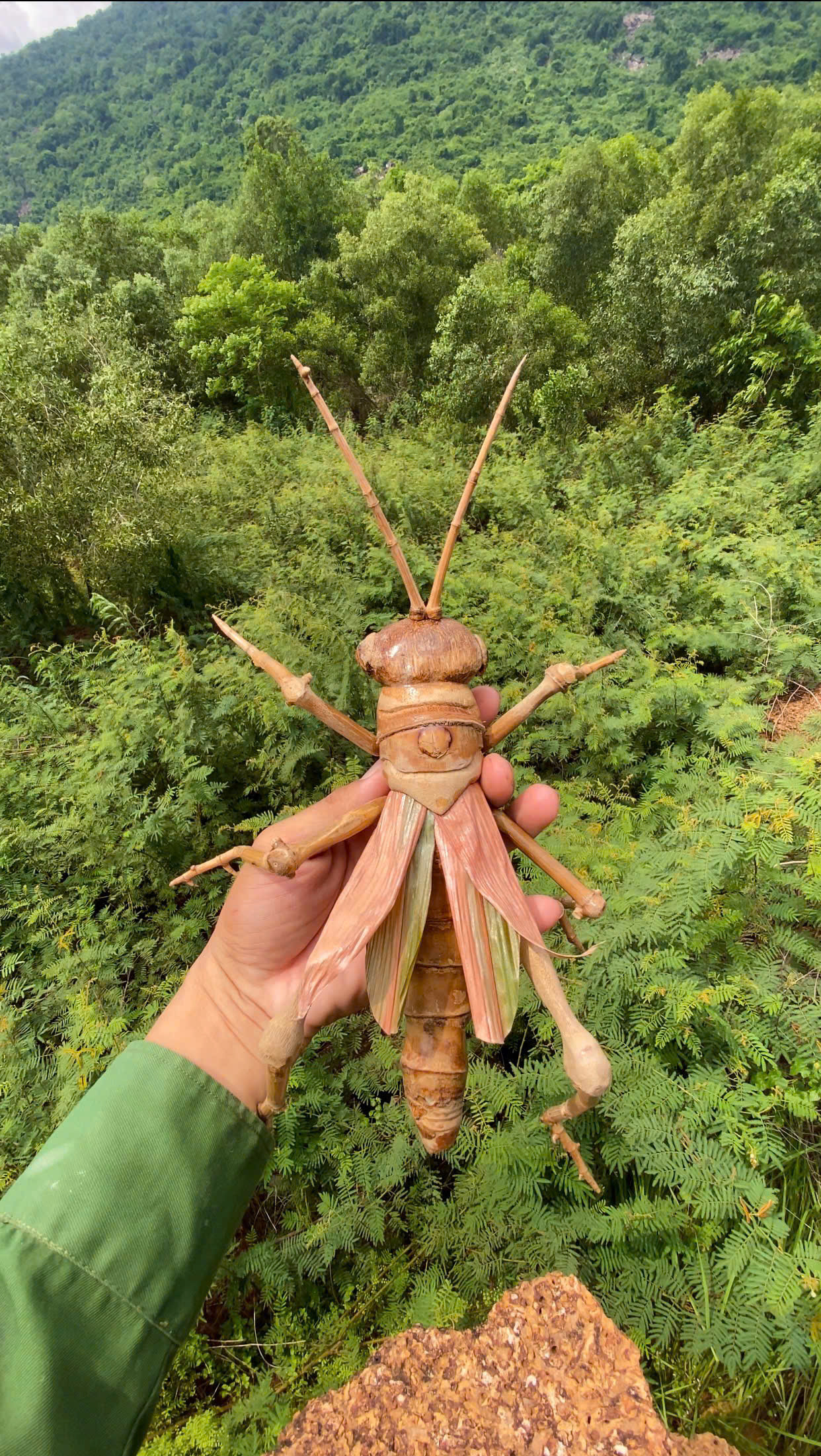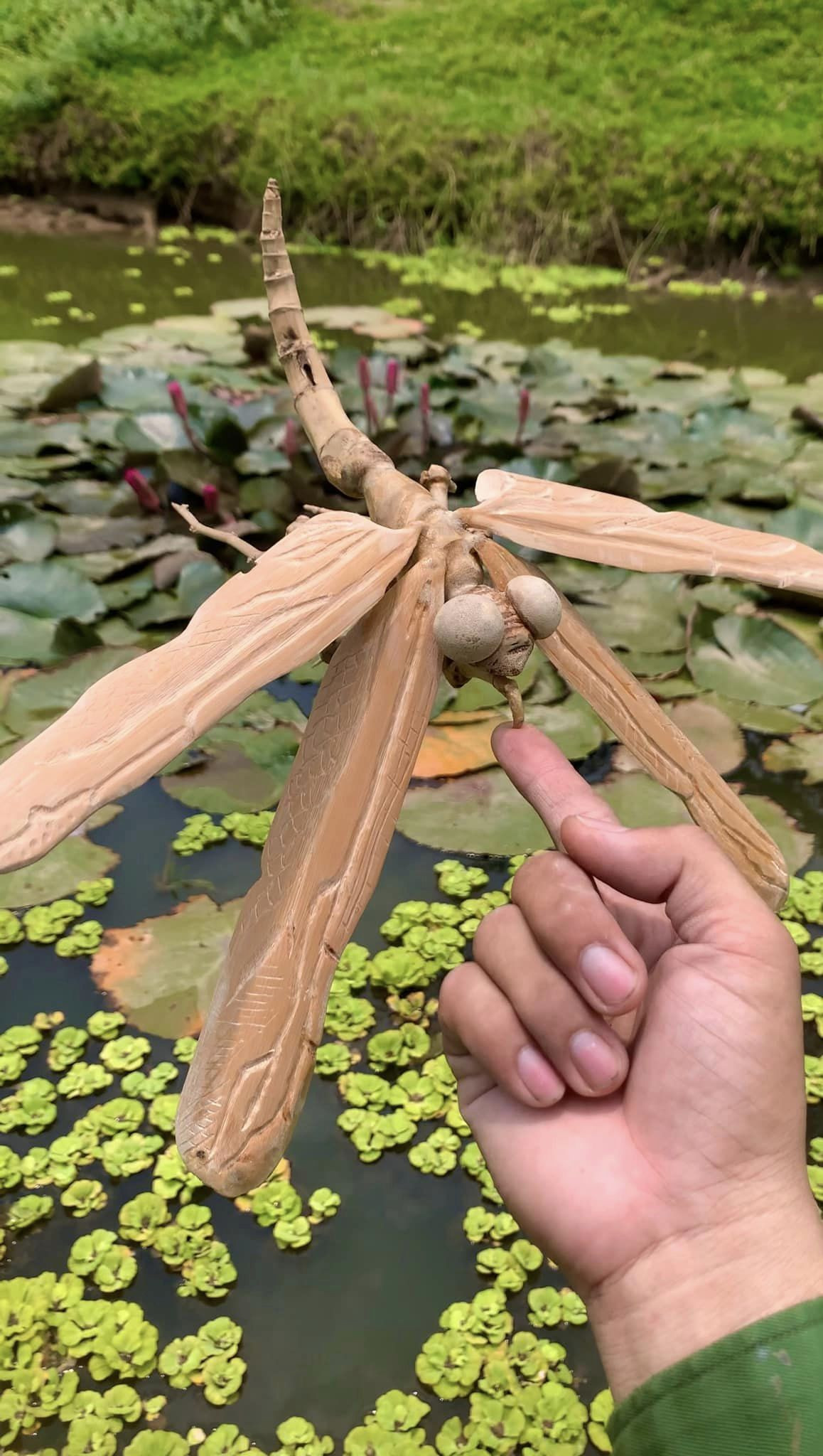 Tính đến nay, anh đã sáng tạo được hàng chục sản phẩm thủ công mỹ nghệ độc đáo từ chất liệu “cây nhà lá vườn” với đủ kích cỡ, hình dáng khác nhau. Có thể kể đến như: Châu chấu, gà trống, long quy,… Trong đó, mẫu “ếch hứng bi” là khó nhất, đòi hỏi nhiều công sức và thời gian.