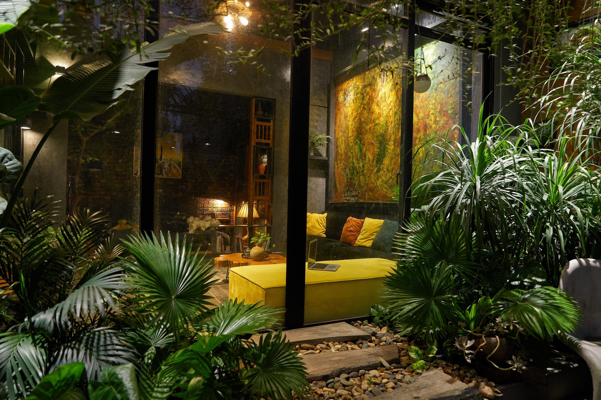 Gần một nửa diện tích đất được gia đình sử dụng làm sân để xe phía trước nhà và khu vườn nhỏ phía sau. "Thời điểm đó, so với các nhà ống lân cận, bố mẹ tôi đã xây dựng nhà thông thoáng, có không gian xanh. Tuy nhiên, nhà vẫn thiết kế theo phương án an toàn nên dùng cửa gỗ kín mít, khung sắt bao quanh... Năm 2010, tôi chuyển về đây sinh sống, thực hiện cải tạo: thay các cửa gỗ bằng hệ cửa kính để lấy sáng tự nhiên, sửa thành dạng nhà thông tầng", anh Hùng cho hay.