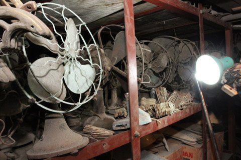 Nói rồi ông dẫn chúng tôi lên kho chứa quạt của ông. Đa phần đều là những chiếc quạt cũ, được tháo rời từng bộ phận treo và để ở khắp nơi trên những chiếc kệ sắt lớn. Mỗi ngăn ông đều chia theo từng dòng quạt, từ kiểu dáng khác nhau đến hoa cả mắt.