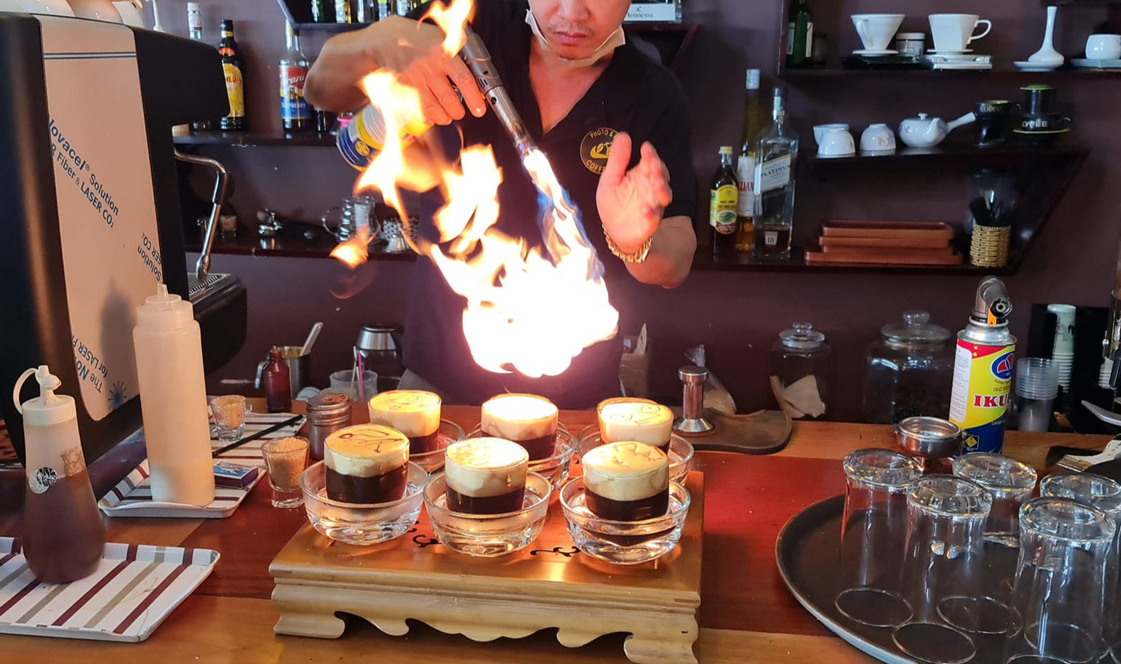 Theo chủ quán này, cà phê được pha chế từ nhiều nguyên liệu như mật ong rừng, trứng, sữa ong chúa và các loại rượu ngoại. Cà phê sử dụng cũng là hạt natural robusta trồng tại vùng B'lao (Bảo Lộc). Sau khi pha chế, cà phê được đốt trực tiếp bằng bình ga mini.