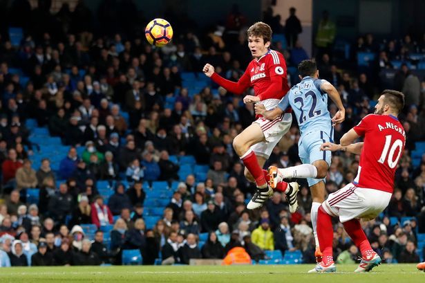 Sức ép ngày càng đè nặng lên khung thành Middlesbrough. John Stones vừa bật cao đánh đầu đưa bóng cắt ngang cầu môn.