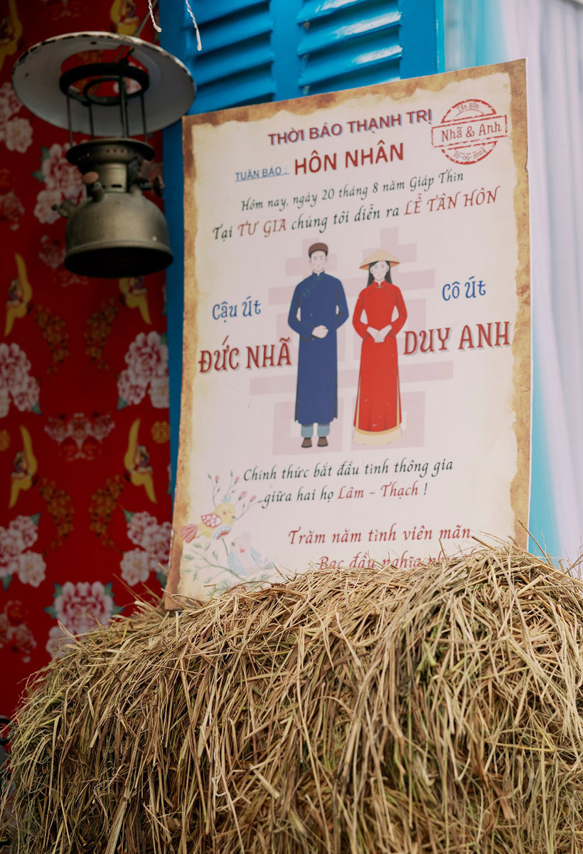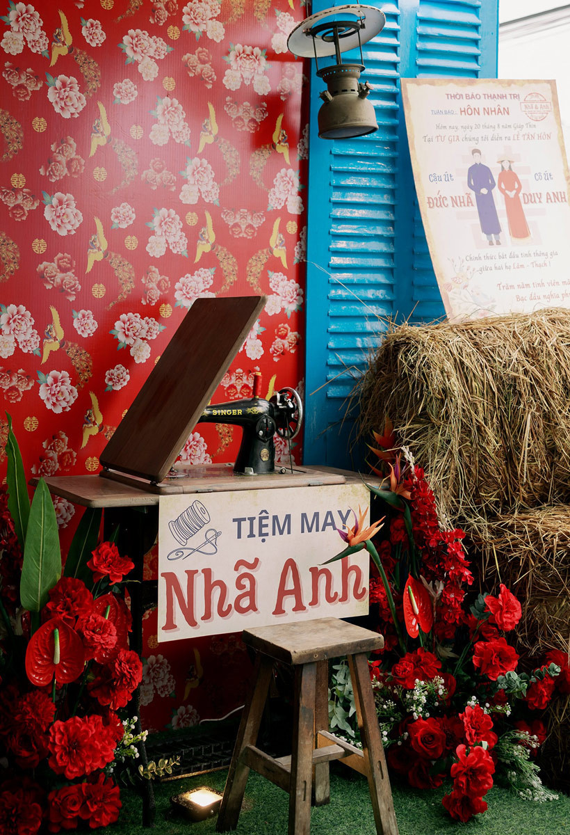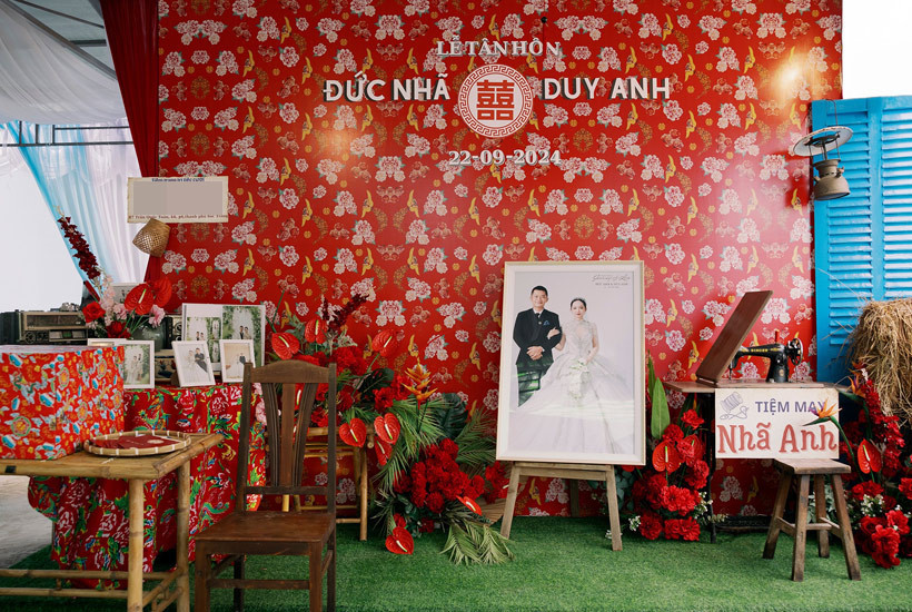 Chú rể Đức Nhã dành 2 tuần để chuẩn bị cho đám cưới đặc biệt. Anh sưu tầm những món đồ cũ như máy may, xe cúp, tivi cũ, đài cassette, giỏ tre,... có thứ phải mua, cũng có thứ mượn từ người thân, bạn bè.