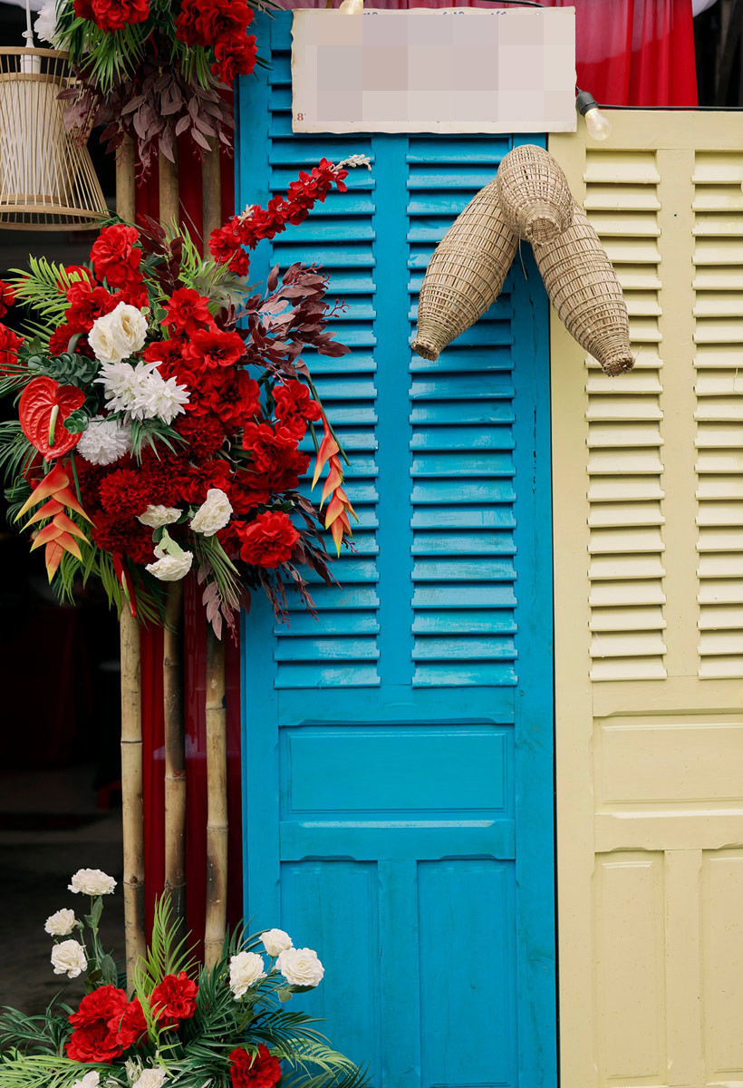 Không gian cưới mang vẻ cổ xưa khiến người nhìn hoài niệm. Cánh cửa gỗ sơn màu xanh, vàng, những chi tiết nhỏ như giỏ tre, đó tre, dải lụa,... gợi lên cảm giác thân quen của làng quê Việt.
