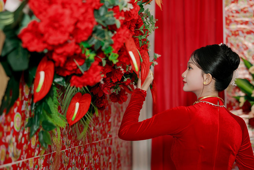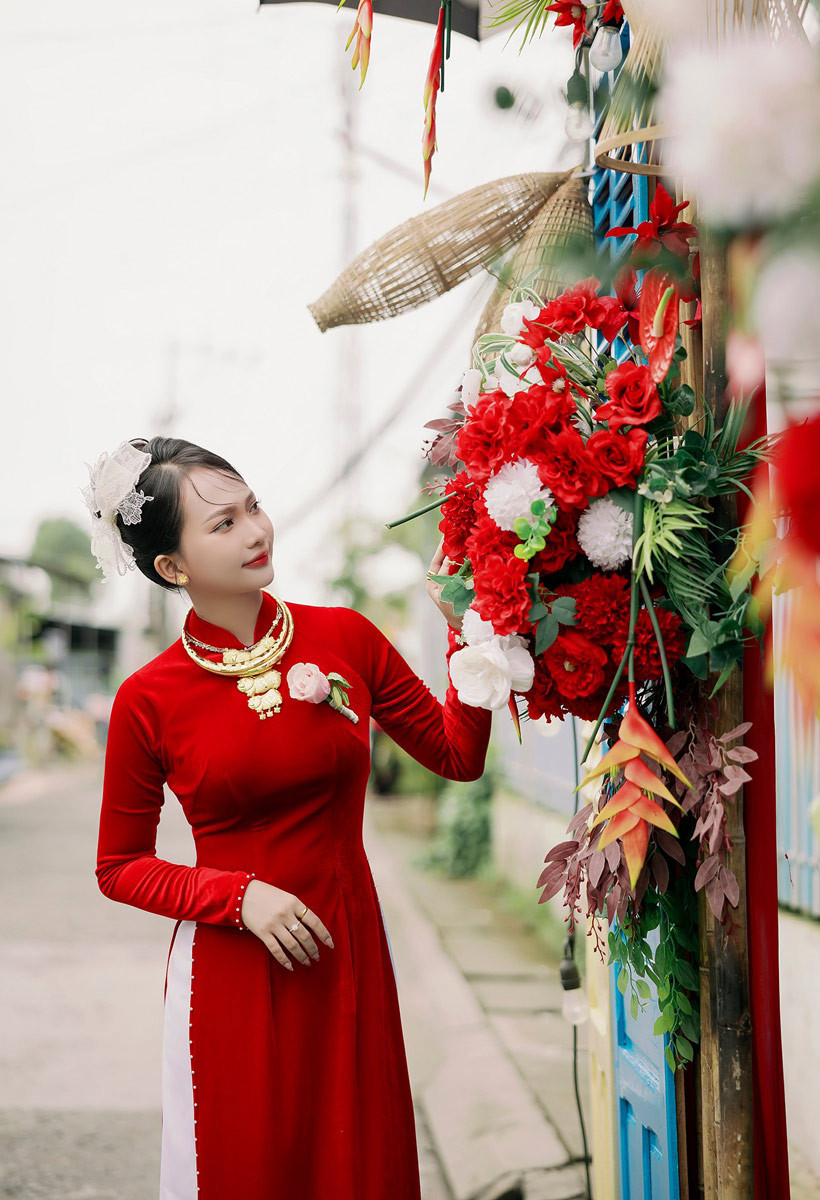 “Theo phong tục quê mình, ngày rước dâu, cô dâu phải mặc áo dài đỏ về nhà chồng, sau đó mới thay váy cưới để bước vào tiệc chính. Vô tình, chiếc áo dài đỏ mình mặc lại rất phù hợp với không gian tiệc cưới chồng chuẩn bị”, Duy Anh chia sẻ.