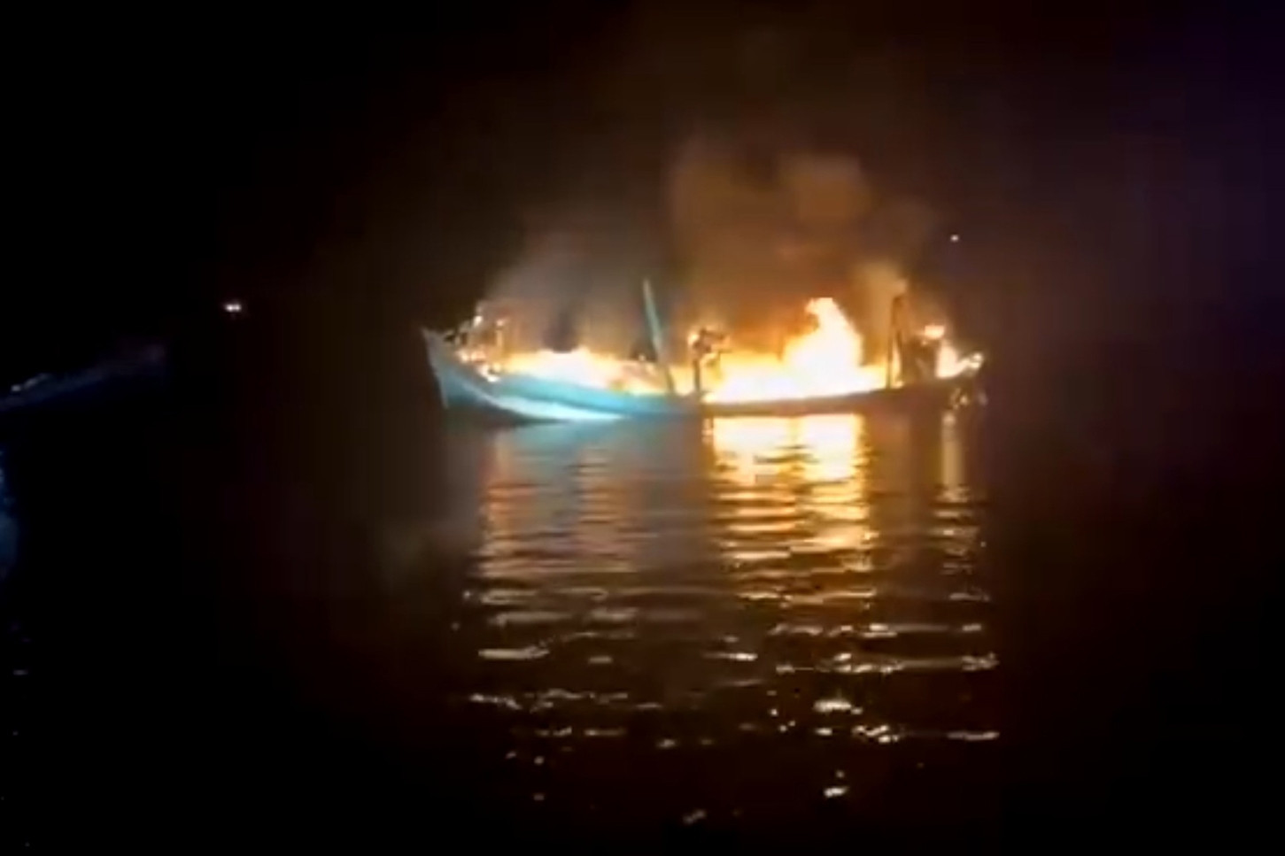 Tàu cá của ông Phong bất ngờ bị tấn công, bốc cháy rồi chìm trên biển. Ảnh cắt từ clip