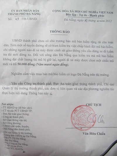 | Thông báo của Chủ tịch UBND TP Đà Nẵng về việc người dân chỉ được mua đổi mũ bảo hiểm khi đã được kiểm tra mũ đang dùng. |