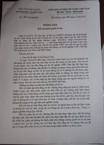 Thông báo nêu rõ, lãnh đạo Hội đồng coi thi: Buông lỏng công tác quản lý, thiếu trách nhiệm trong việc điều hành, giám sát diễn biến kỳ thi, không phát hiện được những tiêu cực ở Hội đồng coi thi trong quá trình điều hành thi.
