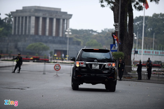 Xe dẫn đoàn vừa đi qua khu vực gần Phủ Chủ tịch. Nhiều người dân và du khách đã đổ về khu vực này, đứng sau những tấm rào chắn được lực lượng an ninh dựng lên.