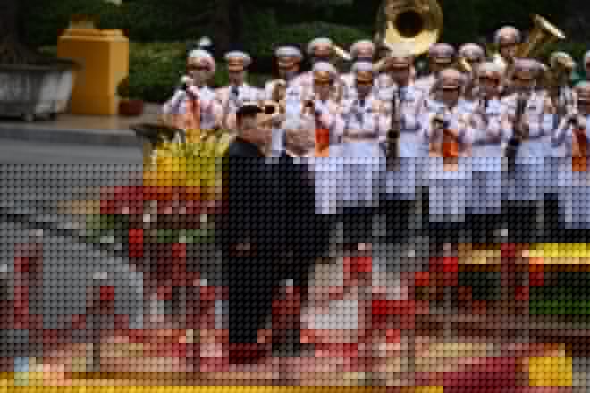 Lễ đón bắt đầu tại Phủ Chủ tịch bằng nghi thức thượng cờ, sau đó Tổng bí thư, Chủ tịch nước Nguyễn Phú Trọng và nhà lãnh đạo Kim Jong Un cùng duyệt đội danh dự.