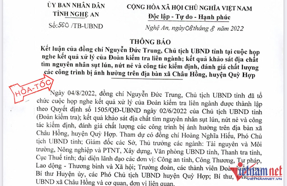 Hôm nay (9/8), nguồn tin cho biết, ông Đặng Thanh Tùng – Chánh Văn phòng UBND tỉnh Nghệ An vừa ký thông báo kết luận của Chủ tịch UBND tỉnh Nghệ An Nguyễn Đức Trung tại cuộc họp nghe kết quả xử lý của đoàn liên ngành; kết quả khảo sát địa chất tìm nguyên nhân sụt lún, nứt nẻ và công tác kiểm định, đánh giá chất lượng các công trình bị ảnh hưởng tại xã Châu Hồng (huyện Quỳ Hợp).