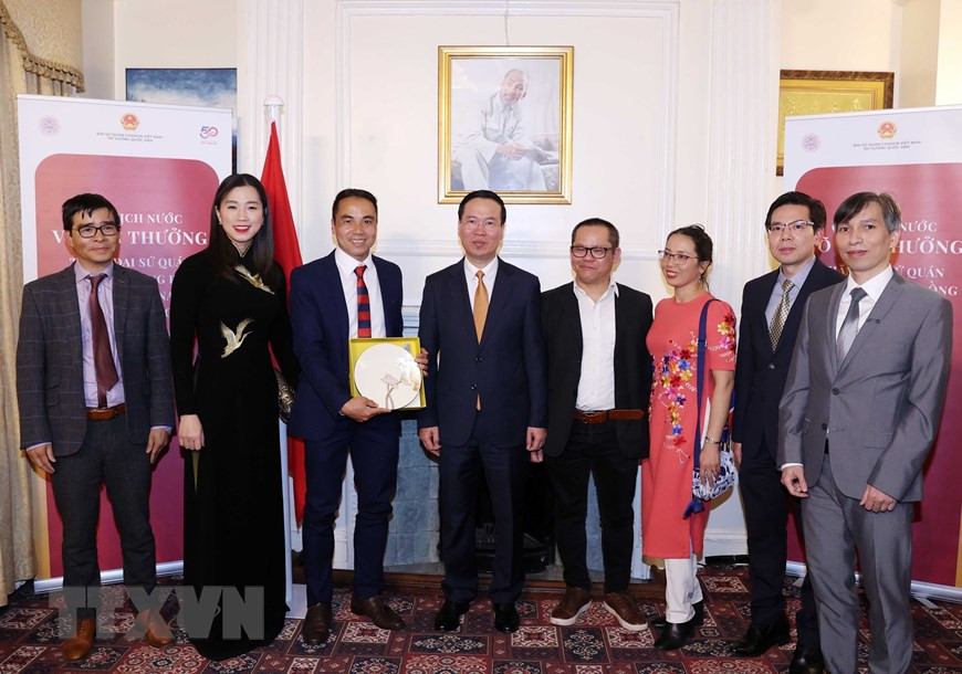 Ngay sau khi đến thủ đô London, Chủ tịch nước Võ Văn Thưởng đã tới thăm cán bộ, nhân viên Đại sứ quán và gặp gỡ cộng đồng người Việt Nam tại Vương quốc Anh.