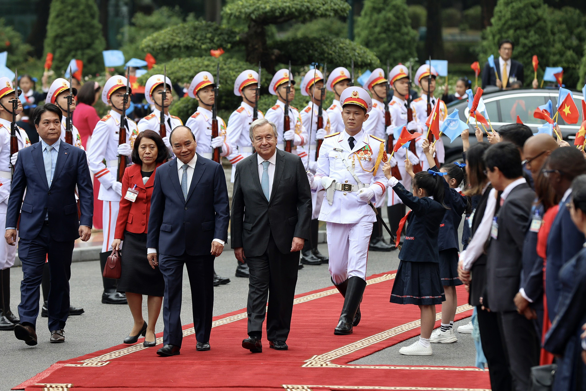 Trong tiếng nhạc chào mừng, Chủ tịch nước Nguyễn Xuân Phúc ra tận cửa ô tô đón Tổng Thư ký LHQ António Guterres. Các em thiếu nhi Hà Nội tay cầm cờ Việt Nam và cờ LHQ vui mừng chào đón hai nhà lãnh đạo. Sau đó, Chủ tịch nước và Tổng Thư ký LHQ giới thiệu thành viên hai đoàn.